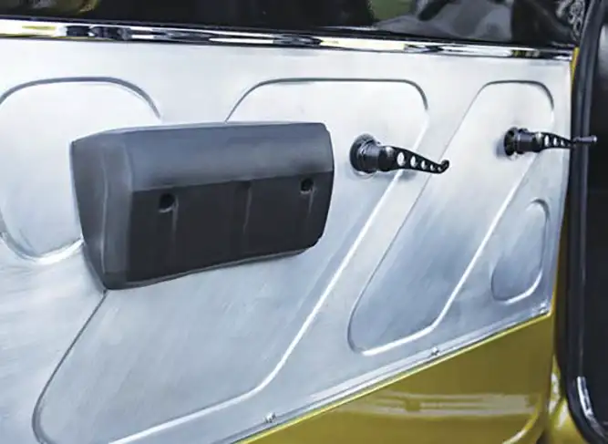 Once all of the metalwork was accomplished, the crew spent countless nights on bodywork. Evercoat Quantum 1 body filler was used to create a smooth finish in preparation for paint at Coast Airbrush. There, Ryno, Tom McWeeney and Cory Saint Clair set about blanketing the canvas in House of Kolor Shimrin 2 Gold and Black.
