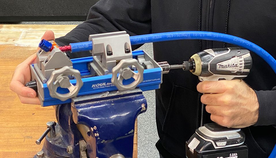 The EZ-ON Hose Press 409B installs both straight and angled fittings from 1/4″ to 1″ sizes in mere seconds. It utilizes a stationary vise to secure the fitting and a traveling carriage to clamp the hose. The hose is then easily installed by turning the drive screw with a ratchet or impact gun.