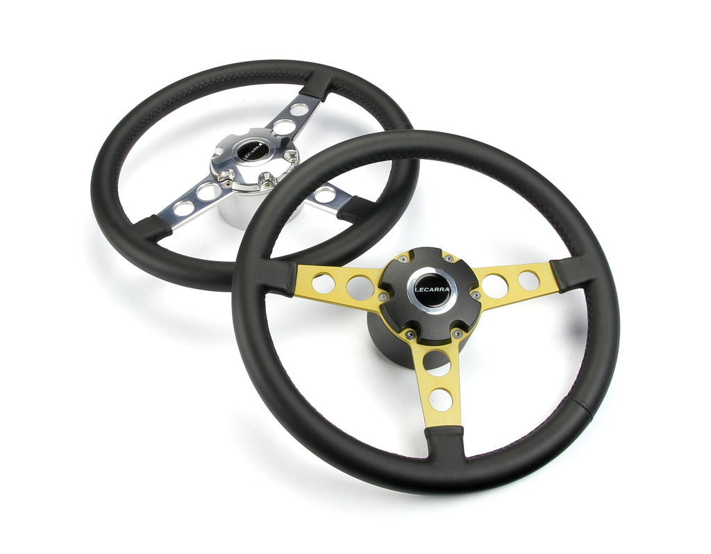 Lecarra’s Trans Am steering wheels definitely conjure up a groovy ‘70s, ‘80s vibe. Modeled after the Pontiac Trans Am steering wheels of the ‘70s and early ‘80s, they’re available in brushed, gold, or black anodized finishes. A fully polished version is also available. They can be used with one of Lecarra’s hub adapters which fit 1967-94 GM steering columns.