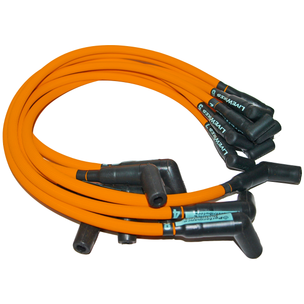 Performance Distributors’ “LIVE WIRES” now come in Orange! Approximately 1/2″ in diameter, the Orange Live Wires perform as well as they look. The low-resistance Orange wires deliver maximum spark energy to your plugs. The wire comes with a space-age, heat-resistant sleeving to provide the best protection from headers and manifold heat. The sleeving provides protection from -76 degrees to +1400 degrees! For your convenience, each end of the wire is numbered to correspond to the correct cylinder. Spiral winding prevents electronic interference. Heat shrink is applied between the boot and sleeve to keep dirt and moisture away from the wire terminals. Live Wires are also available in Red, Silver, Blue, Black, Yellow, and Purple.