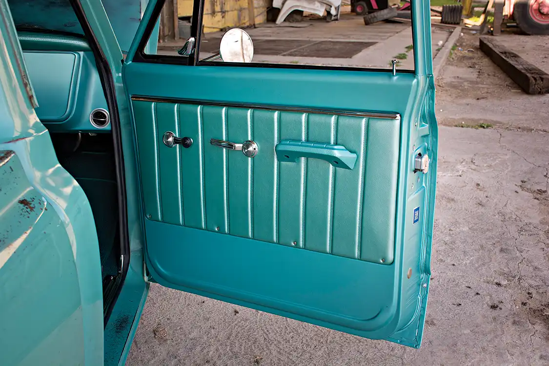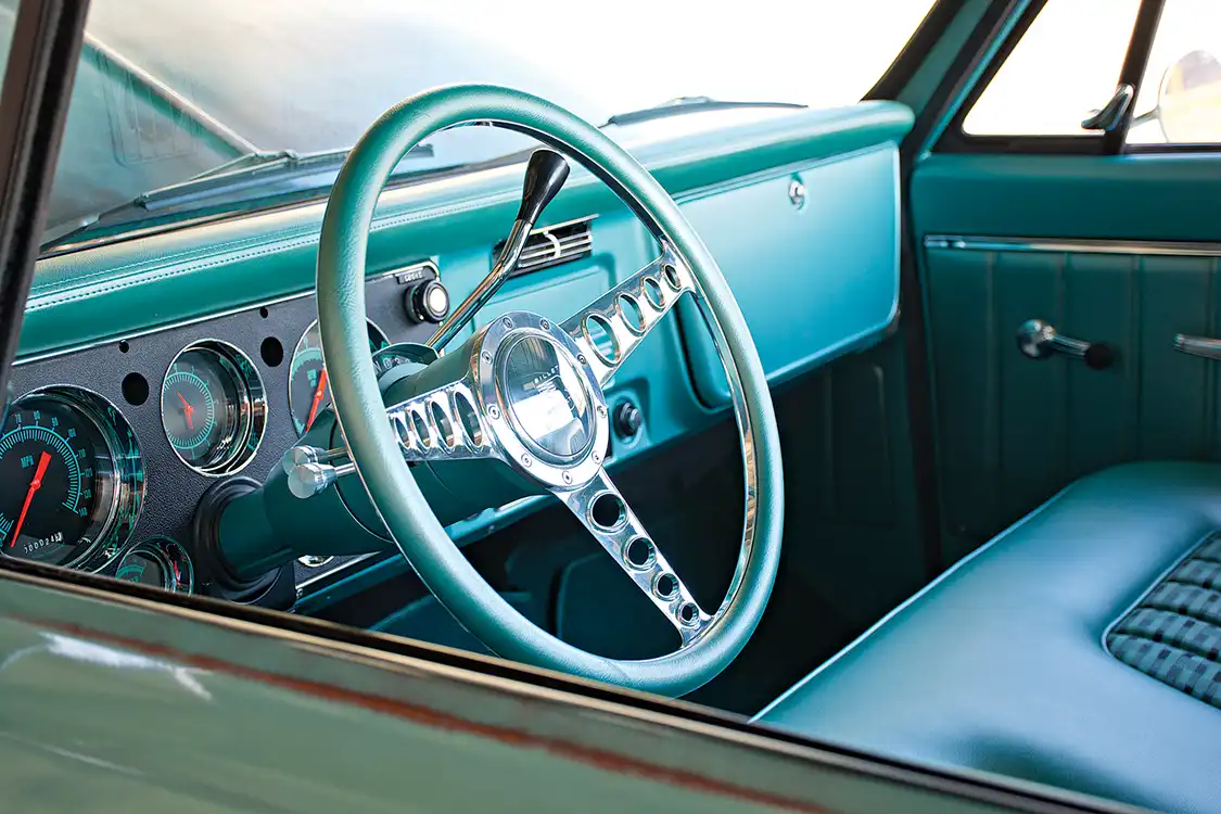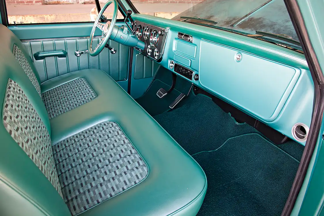 From the stock GM body to the modified fenders and bed, Keith’s C-10 is a priceless showpiece. Under the hood is a brand-new 350-ci crate engine, which gives the truck plenty of modern power despite her aged Ditzler Lacquer Light Green paint. This also includes all new running gear, a complete Porterbuilt air suspension system, disc brakes and Billet Specialties wheels wrapped in Toyo Proxes rubber. The truck’s interior has also been upgraded and features new tan and light green upholstery, Classic Instruments G-face gauges and a Vintage Air A/C system.