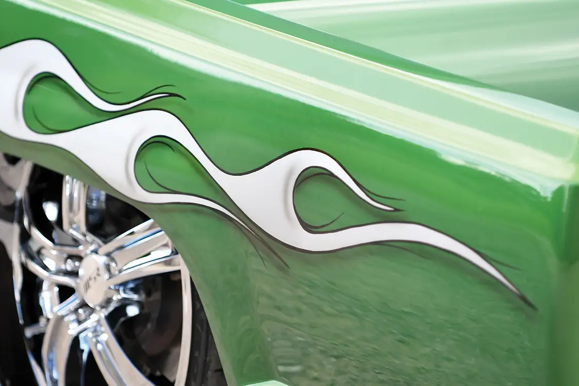 Bodyworkz in Mississauga, Ontario, was enlisted to fix all the bodywork that needed to be repaired before bringing the truck back to life with custom DuPont Jalapeno Green paint with silver flames. The next stop was to Driven Upholstery in Baltimore, Maryland, where Brad Wurzbacher ripped out the old gray vinyl and created a brand-new tan cabin complete with a sound system located underneath a fake rear bench seat. Brad designed the entire street rod look that William wanted with only a color preference and a blessing of full creative control. For the suspension, William updated the bags on all four corners with Slam Specialties RE6 and RE7 bags for a more stable and secure ride.