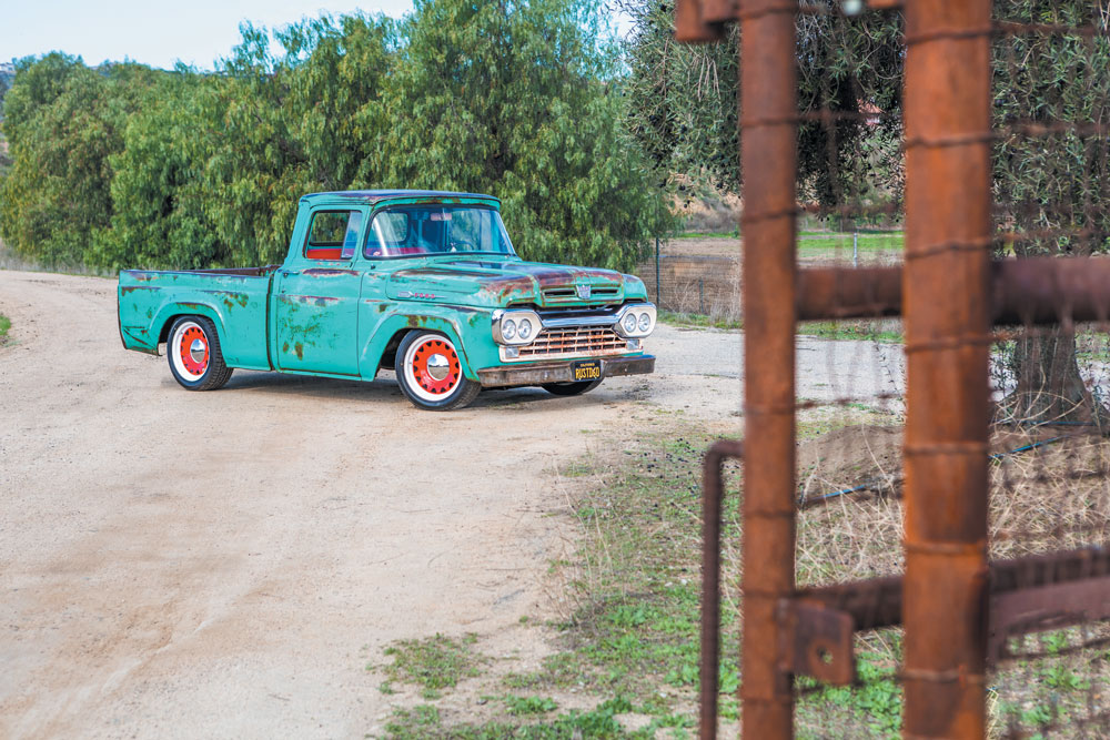 The truck’s exterior is essentially untouched. But there’s no want for aesthetics. The 18-inch wheels sport a bright red center, white lip and polished hub cap. The high contrast complements the truck’s Caribbean Turquoise patina perfectly. The red plays off the factory taillights, Ford badges and natural reds of the surface rust. The white lip teams up with the white-lettered tailgate. And the polished hubcaps bring the all-important dash of chrome to the OG recipe. The original patina and custom tailgate lettering were re-cleared in a matte finish.