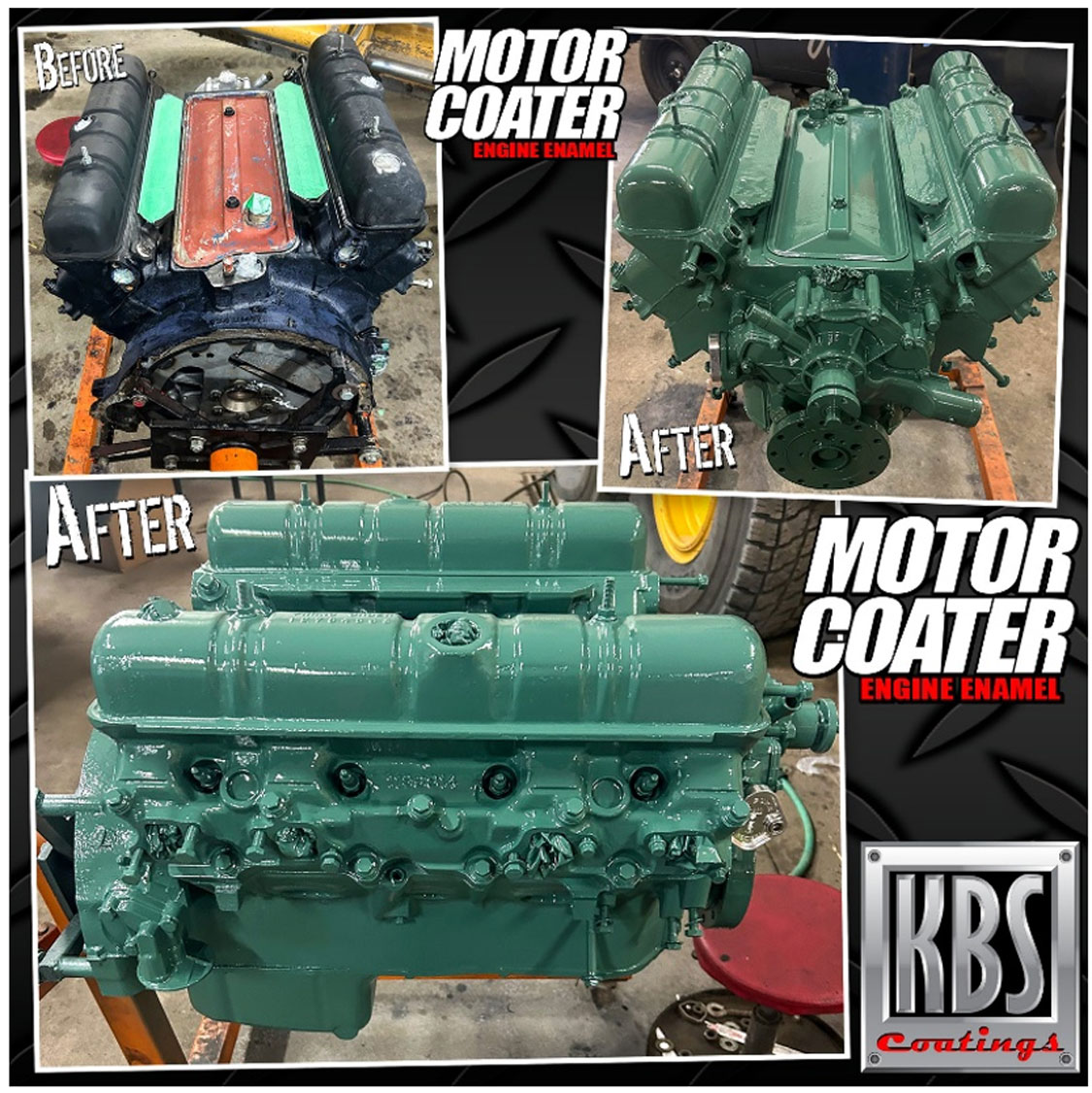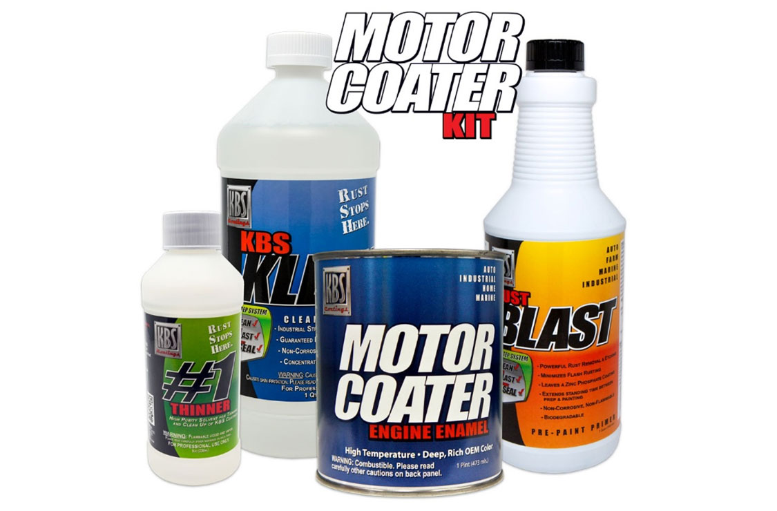 For complete preparation of engines and transmissions, the Motor Coater Kit includes KBS Klean and RustBlast, while Motor Coater Engine Enamel is formulated to deliver durable, high-temperature performance.