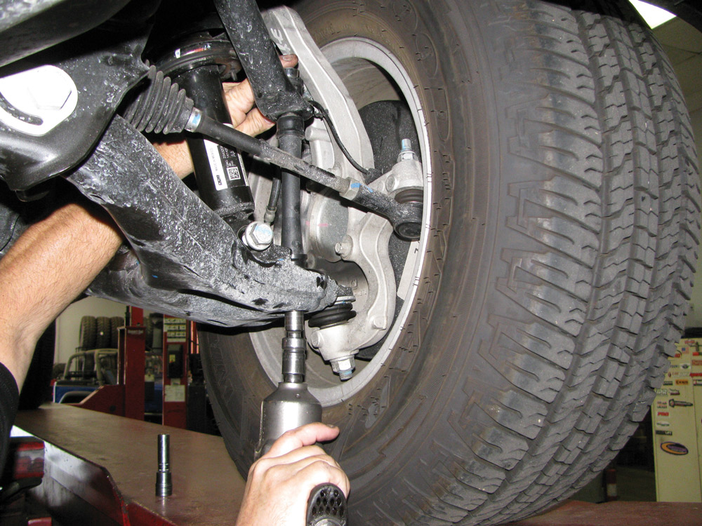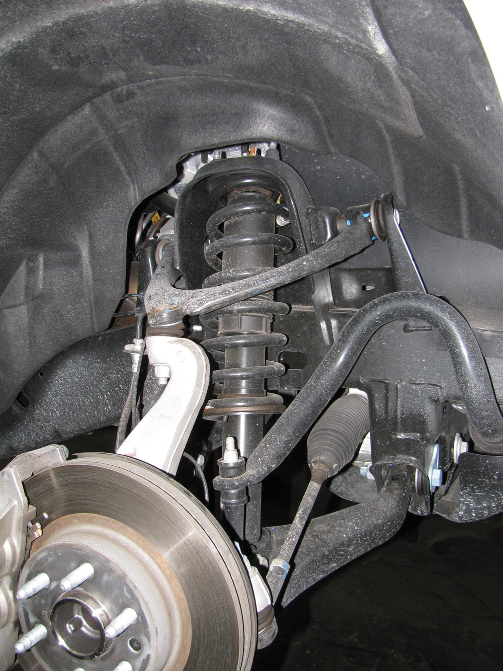 Before we started the job, the Canyon was bone stock and had a bed cover. Time to change that!The ReadyLIFT kit comes with two strut spacers, two sway bar spacers and all of the hardware you’ll need to put everything together.If the Canyon’s front suspension looks familiar to you, it probably should. It’s very similar to the current generation of fullsize trucks with the inclusion of struts and a lot of aluminum parts.First the tie rod end is disconnected from the steering knuckle, which starts by taking off the nut. See that hex end on the top of the tie rod? It’s designed so that you could use an impact hammer on it without deforming the threads, making it easier to remove. That’s exactly what our tech did.The sway bar end links were unbolted, and this time he did both sides, one after the other. This makes it a bit easier to maneuver around as he works.Disconnecting the steering knuckle from the upper control arm is best done by loosening the ball joint nut until it hides all the threads. Then put a jack underneath the lower control arm and take the bolt off all the way. Once you lower the jack, the pressure will slowly come off the connection and you can separate the two.There are a few brake line bolts on the back of the steering knuckle. You could leave them on, but removing them gives you more room to work.There are three bolts that hold the struts to the frame, and they come off with an open-end wrench. A single nut/bolt combo is on the bottom of the strut, and it comes off with an impact.Before you take the strut out all the way, loosen up the sway bar mounting bolts. This will give the sway bar some play and make it easier to move.With the strut out, the suspension is all clear.We move now to the workbench where the kit is preassembled. It comes with new strut bushings and a new cap, and it’s made to bolt in place of the OEM strut cap.Before disassembling the strut, the positions of the coil, strut cap and strut cap rubber bushing are all marked with a paint marker. Even though we’re not using the original cap, the mark will help line everything up properly by giving us a general idea of placement.With the strut placed in the spring compressor, we compressed the spring and then removed the strut bolt at the top. Once we were done we could pull the strut out from the bottom of the coil.The stock rubber bushing at the bottom of the OEM strut cap is placed inside of the ReadyLIFT strut cap that came with the leveling kit.Installing the cap on the factory springs and strut is the reverse order of disassembly, except now the spring needs to be put under more tension so that you can get the cap on and tightened down. It’s a bit of a squeeze, but it can be done.Getting the now taller strut in place can be tough. Because it’s taller, you have to push down on the lower control arm to get the bolt in, which isn’t always easy. Plus, moving it around these parts can be frustrating. Just take your time and do it right.Placing the upper control arm into the steering knuckle is definitely a challenge. We used a mammoth pry bar and jack to get the job done, and even then it wasn’t a ton of fun. That said, once it’s in there, you’re golden.The rest of reassembly is reinstalling the strut bolts, brake line bolts and tie rod end, leaving the sway bar for now.Remember how we loosened the sway bar mounts earlier? Now we took them out all the way.Because the suspension geometry is different now, placing a spacer between the frame and the sway bar mount will ensure that things line up properly. Bolting them in place is as easy as unbolting the stock mounts, placing the spacers between the frame and the sway bar mounts, and bolting them in with the provided longer bolts.Before any of the suspension bolts are tightened up, the truck is rolled onto an alignment rack so that everything is kept nice and square.With the truck aligned and good to go, the sway bar end links are reconnected and all of the suspension bolts are cinched back up.Since the truck only has a mild lift, the owner went with 17-inch Eagle Wheels Series 016 and 265/70R17 Toyo M/Ts. Any wider and Desert Rat said we’d have to start cutting, and that wasn’t what the owner had in mind.The completed truck now has a nice, level stance, and with the help of the bigger tires, gets just a touch higher, perfect for a daily driver.