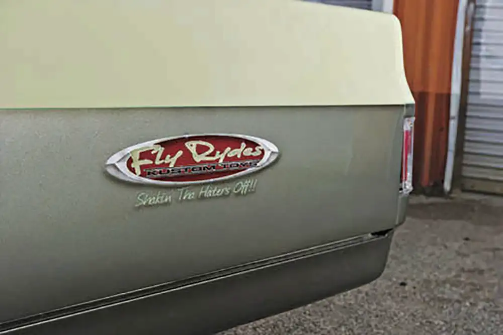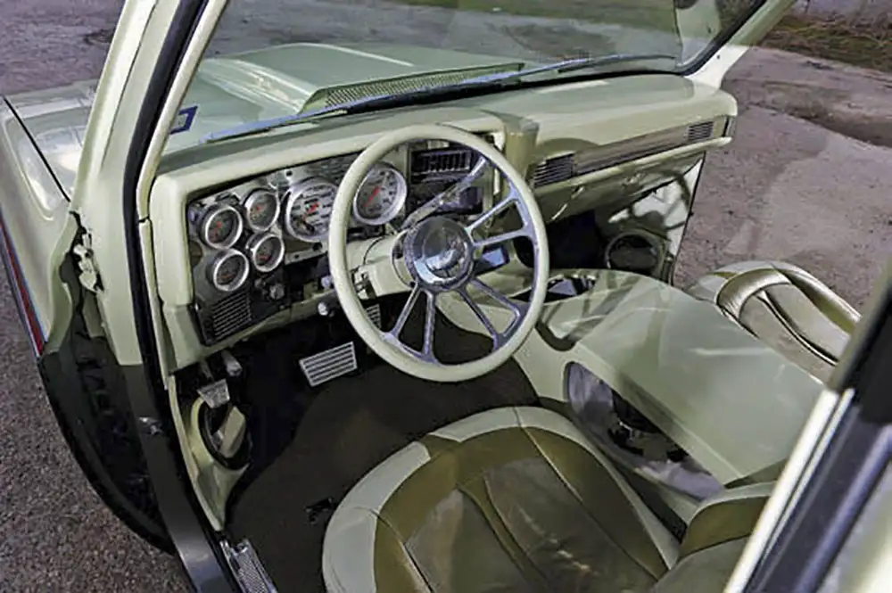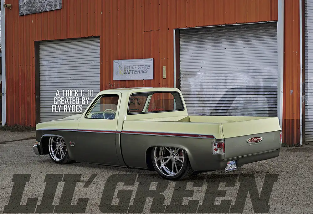 The exterior got the most attention. Walter D shaved the door handles, mirrors and gas door; welded up a Grant Kustoms roll pan and gave the doors the suicide treatment. One Piece Products windows were installed. Up front, the grille was swapped for a 1990 GMC shell with LMC Truck headlights and a custom Fly Rydes emblem. Finally, Ernest laid down a two-tone PPG paint scheme in a mix of green and cream pearl. Brent Lindamood was brought in to airbrush and stripe a set of classic trim-inspired red graphics and custom emblems on the truck.