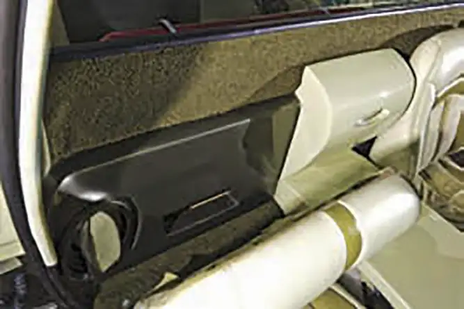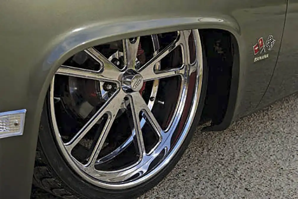 The interior was not to be outdone, however. The carpeting was replaced with old school green loop, and the factory plastics were dyed to match the rest of the two- tone. The seats were covered in a combination light green leather and suede. Ernest fiberglassed the factory dash smooth so it could be painted to match before installing a billet gauge panel complete with Auto Meter gauges and a Billet Specialties steering wheel. A Vintage Air setup was a must.