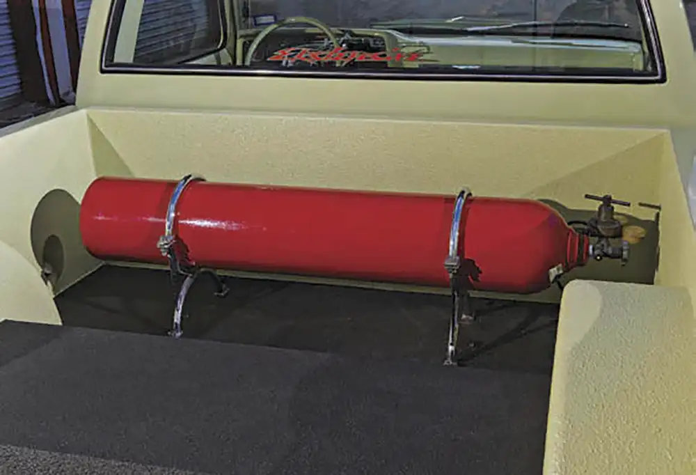 The truck’s transformation began when it was delivered to nearby Ekstensive Metal Works to be put on air. The crew at Ekstensive notched the frame, Z’d the front cross member and installed a 2-link setup with KYB shocks on the rearend that was narrowed 4 inches and outfitted with 1996 Impala disc brakes. Up front, custom control arms were used with 3-inch drop spindles. The airbags are supplied with plenty of nitrogen thanks to a painted tank mounted into the smoothed and lined sheet metal bed. Stainless steel brake lines and Billet Specialties pedals were added to help bring the massive 24 x 9- and 24 x 11-inch Intro Retro billet wheels wrapped in 235/30 and 295/35 Nexen tires. Next, Ernest transplanted a 1997 Chevrolet 5.7L LT1 motor into the C-10 and outfitted it with MSD ignition, Hedman headers and Magnaflow 3- inch exhaust. A Be Cool radiator takes care of cooling the truck during humid Houston summers.