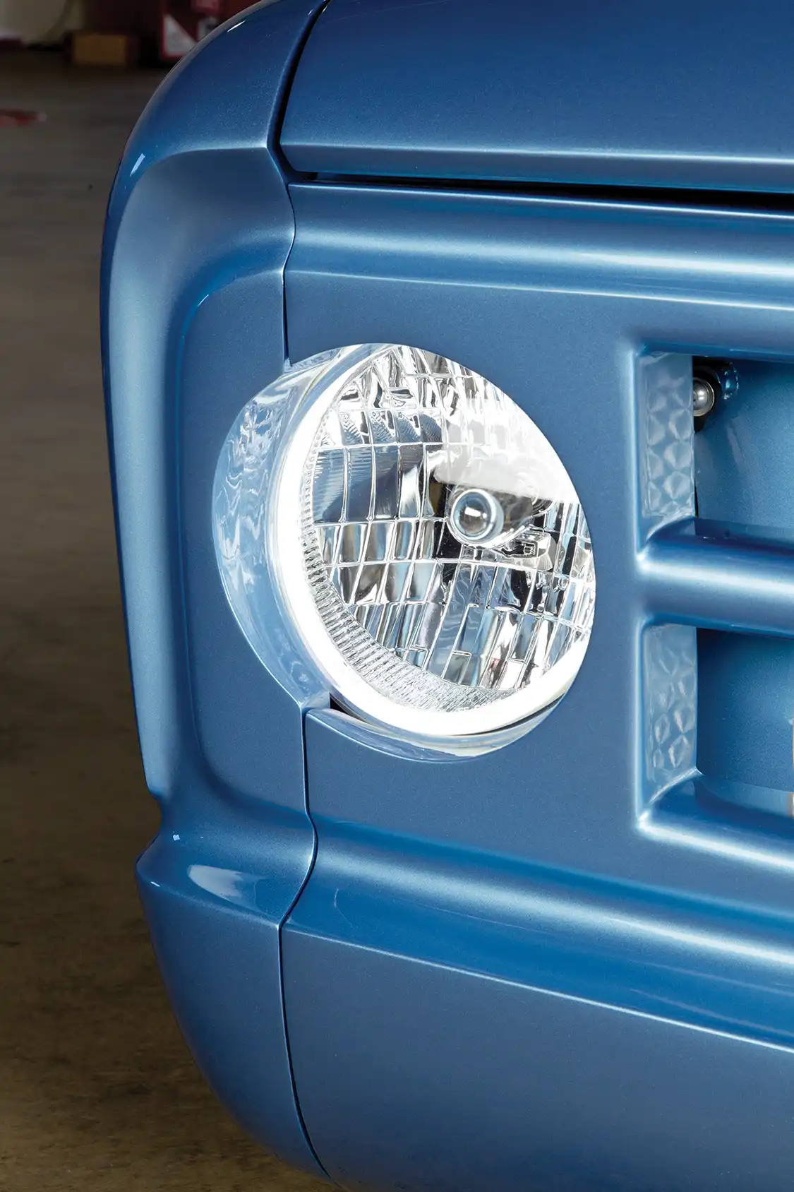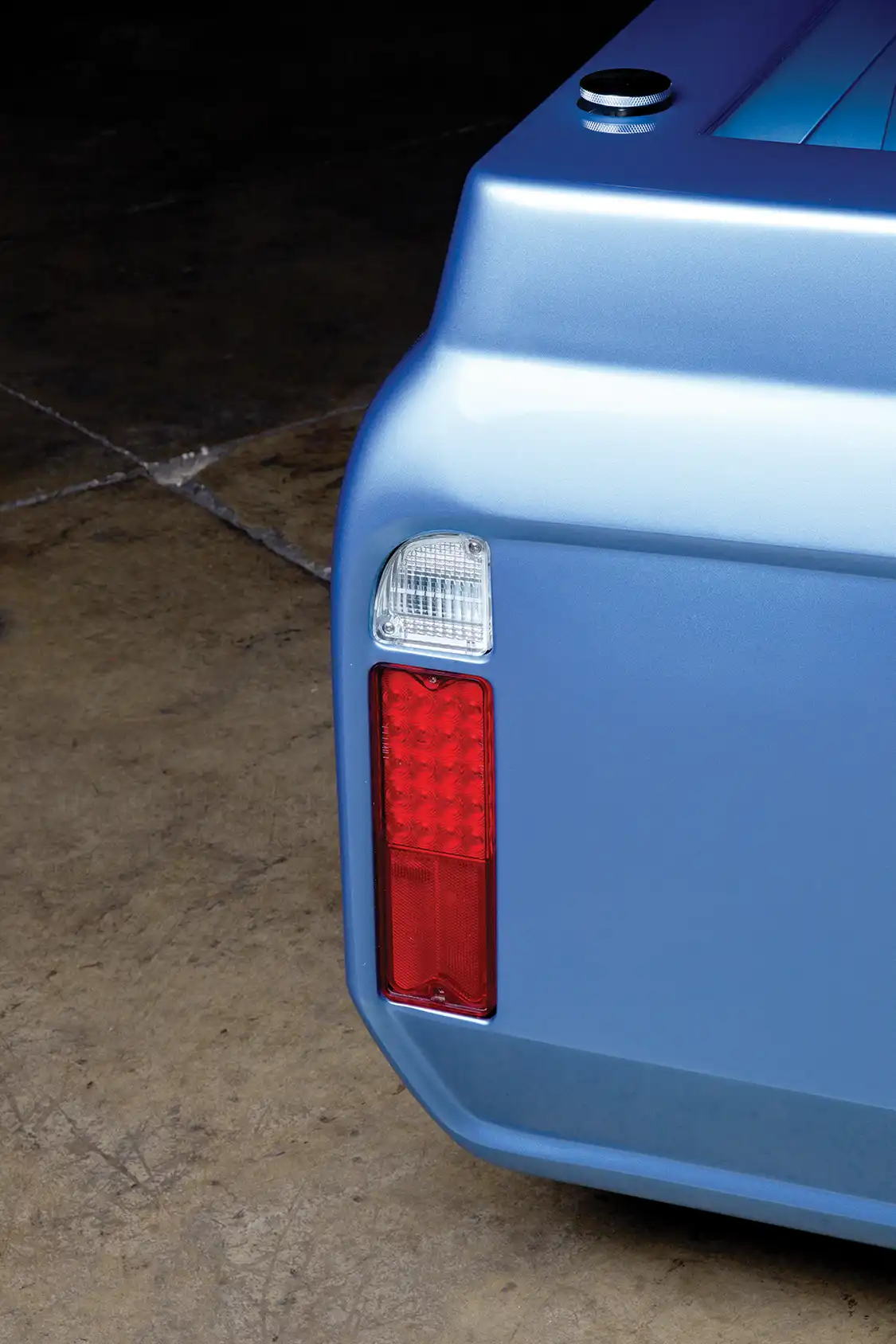 When the chassis was finished, it set the tone for the rest of the build. John installed a rebuilt 355-ci Chevy small-block engine purchased from his friend Jason Oliveira. Then a Turbo 400 was bolted behind it, and the complete chassis was slid under the body before it went back to Aaron Iha for some trick body mods. Starting with the front, John implemented a set of headlights from a 2004 Jeep Liberty. The original grille was modified to fit them and opened up to show off the custom core support. Behind this lies a custom set of inner fenders, smoothed firewall and one-off hood hinges. The bed received a Grant Kustoms Cali tailgate/roll pan combo skin, while the inside got full custom bead-rolled sheet metal with chromed strips.