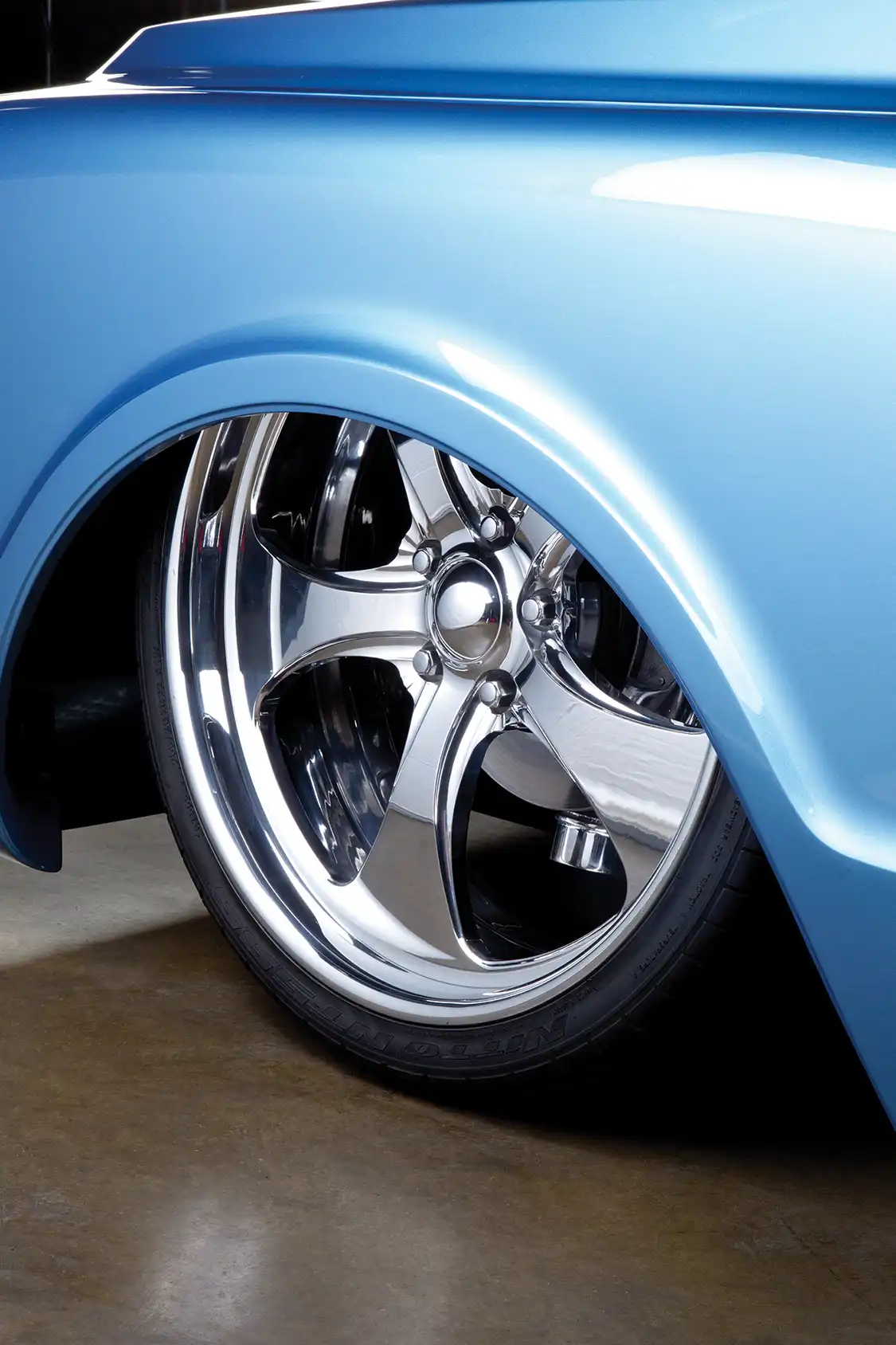 Then the truck was entrusted to long-time friend David Jameson at Little Shop of Kustoms for paint. Shooting for a high- class appearance, John and his wife Marisol chose Silver Lake Blue, a color they’d seen on a Bentley. The frame was sent to the powder coater, while the suspension and all of the hardware were chromed. The body was worked straight and covered in sealer primer before being sprayed with Dupont paint and four coats of clear. To finish some details, John, David and fellow Severed Ties club member Sixtoes helped by making stainless steel braided and hard lines throughout the truck.