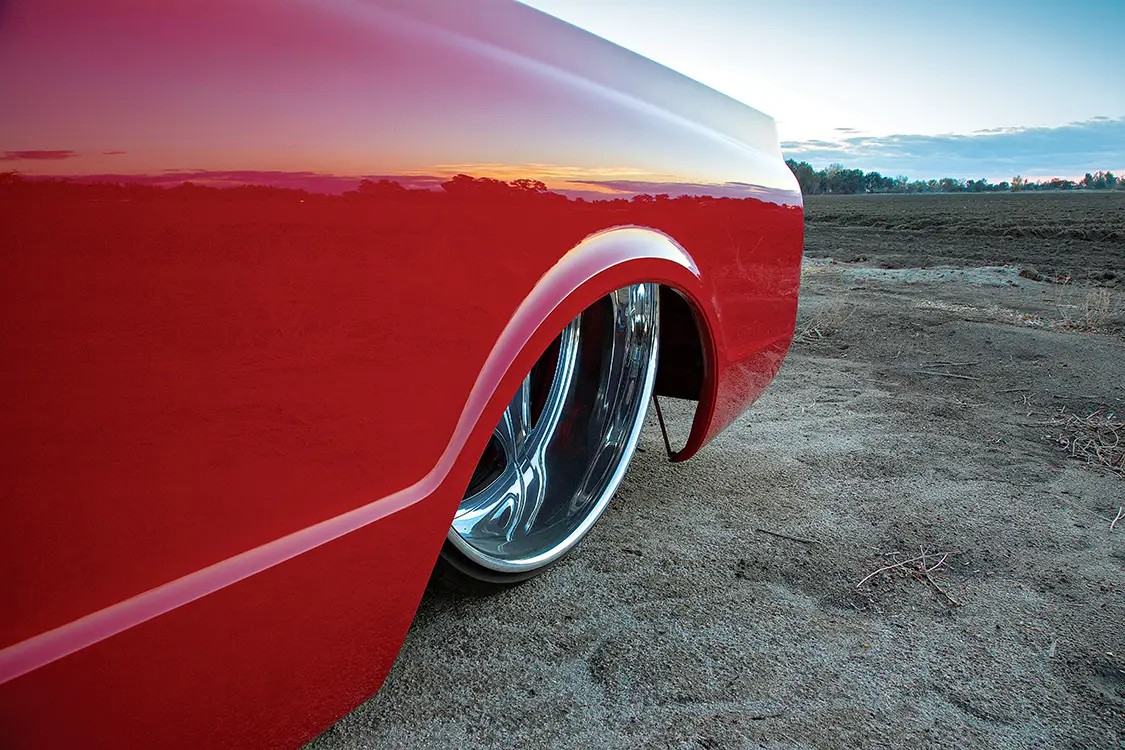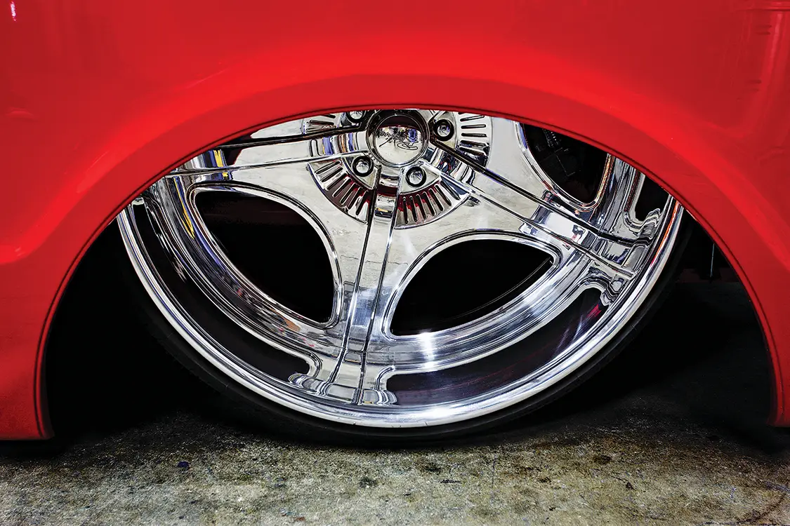 His first step was to lay the rockers flat on the pavement. He used Art Morrison Max G frame rails with a custom Choppin’ Block triangulated 4-link setup in the rear. The link bars control the movement of a Ford 9-inch rearend that was narrowed 12 inches and uses Moser axles to accommodate a set of 26×12-inch Raceline Scoundrel wheels with minimal backspacing.