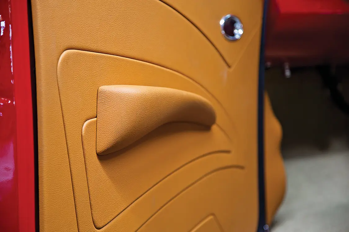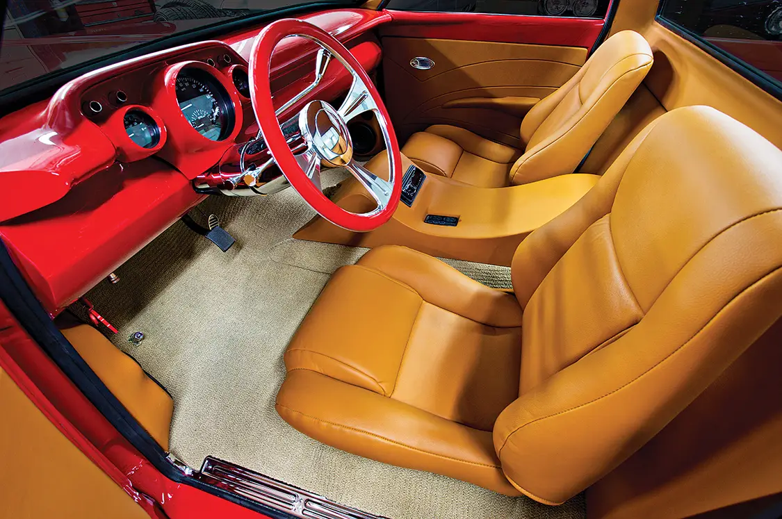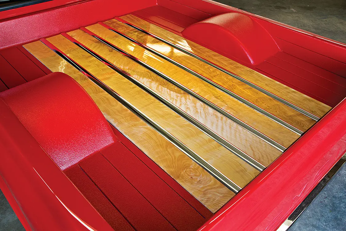Once all of the metalwork was completed, Lewis Milinich Body Shop slicked it smooth and dusted it in DuPont Victory Red. They also hit the raised bed floor and wheel tubs with bed liner. The center section of the wood floor comes from Bed Wood and Parts, and the glass and one-piece windows were installed at Chad’s Auto Glass.