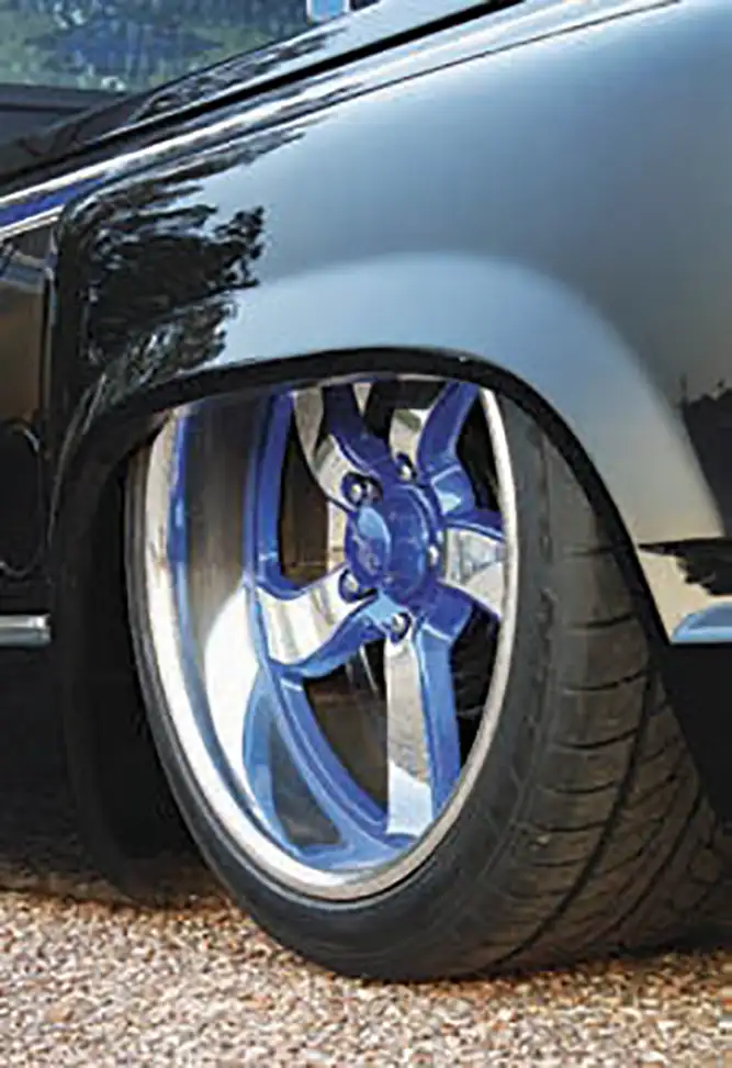 The front suspension still consists of Air Ride Technologies control arms, Firestone 2600 airbags, Belltech dropped spindles and KYB shocks from a ’94 4WD Toyota Tacoma. The rear lays with help from an Ekstensive 2-link with panhard bar and another set of Firestone ’bags and KYB shocks. This was all configured to bring the body down over a set of 20 x 8.5 and 20 x 10 Raceline Deceptive billet wheels with custom blue powder coating. They are wrapped in a set of 255/35R20 and 275/35R20 Nitto 555 tires. Helping to bring them to a stop is a pair of ceramic brake pads with drilled and slotted rotors from Brake Performance.