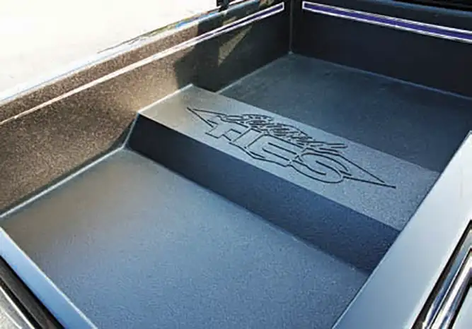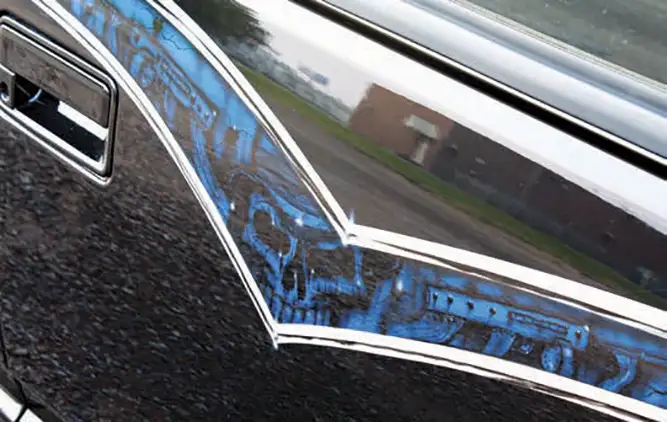 To slick it out a bit, the antenna, third-brake light and stake pockets were shaved. While Jeremy Pounds, of Mo’s Paint and Body of Bogalusa, Louisiana, worked the body straight so it could be painted PPG Jet Black, Chris helped out and took some pointers. Before the clear was applied, Patrick Reid of Mad Concepts in Galveston, Texas, drove down, and took a weekend to add the PPG World Rally Blue Pearl stripes with inset graphics of mobster-themed skulls to warn away any of this truck’s enemies. The bed was lined by Jeremy Pounds to mimic the paint. Chris wanted to rep his club in a big way, so he sent his back glass to Jaime McBride in SoCal to have Bob Thompson paint the logo on it.
