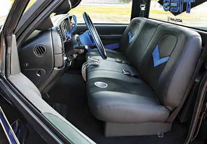 LAWRENCE BERGERON OF LB UPHOLSTERY WAS DOWN TO TAKE TIME OUT OF HIS BUSY SHOP SCHEDULE TO HELP CHRIS GET HIS INTERIOR DONE UP. THE HEAD REST WAS CUT OFF, AND THEN THE BENCH WAS COVERED WITH DIFFERENT HIDES TO MATCH THE PAINT JOB. CUP HOLDERS KEEP CHRIS’ CROTCH FROM TAKING ANYMORE HITS.LAWRENCE BERGERON OF LB UPHOLSTERY WAS DOWN TO TAKE TIME OUT OF HIS BUSY SHOP SCHEDULE TO HELP CHRIS GET HIS INTERIOR DONE UP. THE HEAD REST WAS CUT OFF, AND THEN THE BENCH WAS COVERED WITH DIFFERENT HIDES TO MATCH THE PAINT JOB. CUP HOLDERS KEEP CHRIS’ CROTCH FROM TAKING ANYMORE HITS.