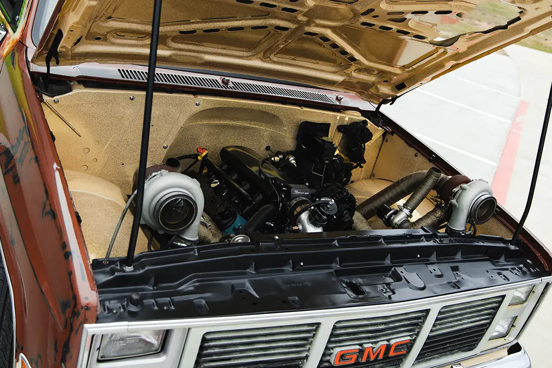At first, they dropped the C10, slapped on some wheels, and called it a shop truck. That lasted ‘til a burnout cooked the stock motor. After that, Old Mac got serious. It soon received a junkyard 5.3 LS, twin VS Racing turbos, Holley intake, Terminator X Max tuning, and a side-exit exhaust out the old gas doors. Friends told ‘em not to punch the turbos through the hood, but they did it anyway, and man, it makes the truck.