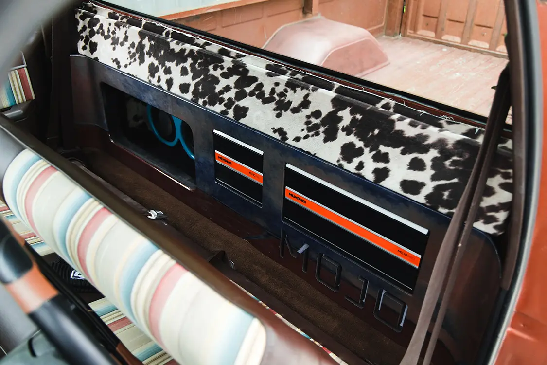 • Handmade door panels, custom-stitched headliner, cow print dash cap
