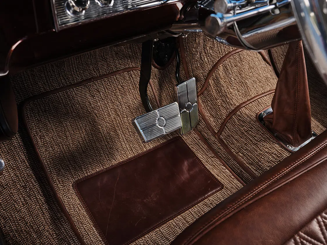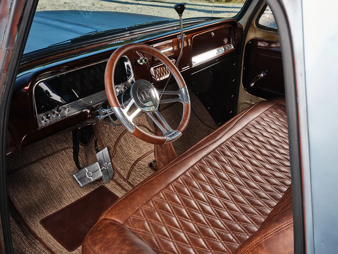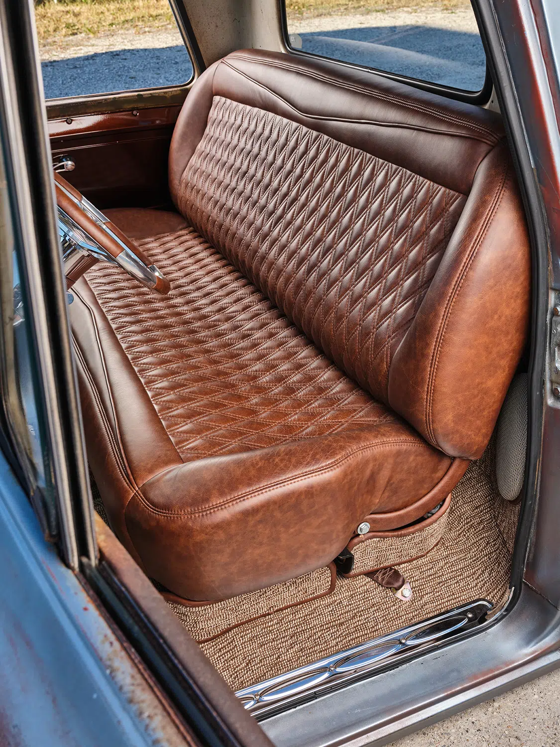 With the paint complete, the truck moved on to Hank Upholstery, where Jeff Burroughs and Robbie Collins began work on the interior. The seat was completely remade using Relicate Amber Glow leather, ensuring the highest quality. The diamond theme carries throughout the truck, from the engine covers to the interior. Robbie went above and beyond, incorporating the Coach Side by Side shotgun that Jay’s close friend Leo Renaud had bought him for his 35th birthday into the backseat design. Relicate Honey Brown carpet was used to cover the flooring, with the edges wrapped in leather.