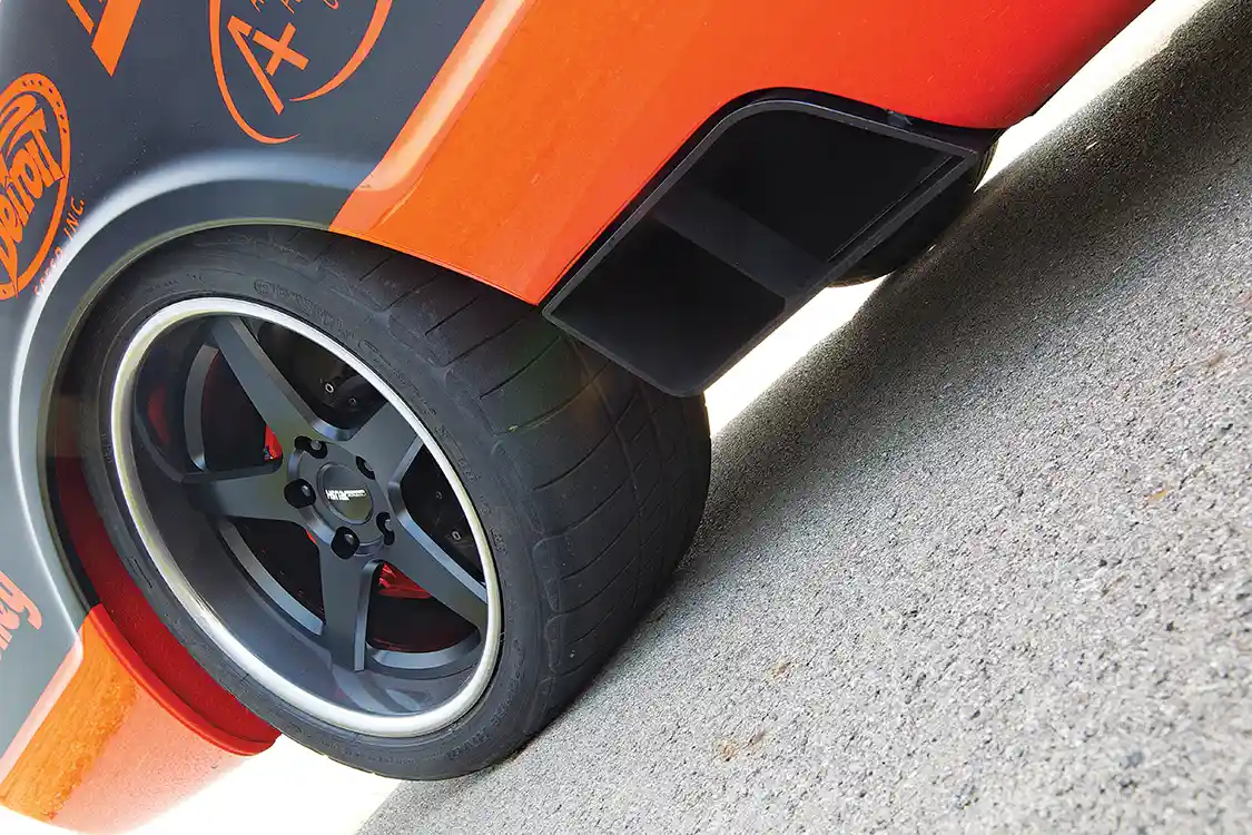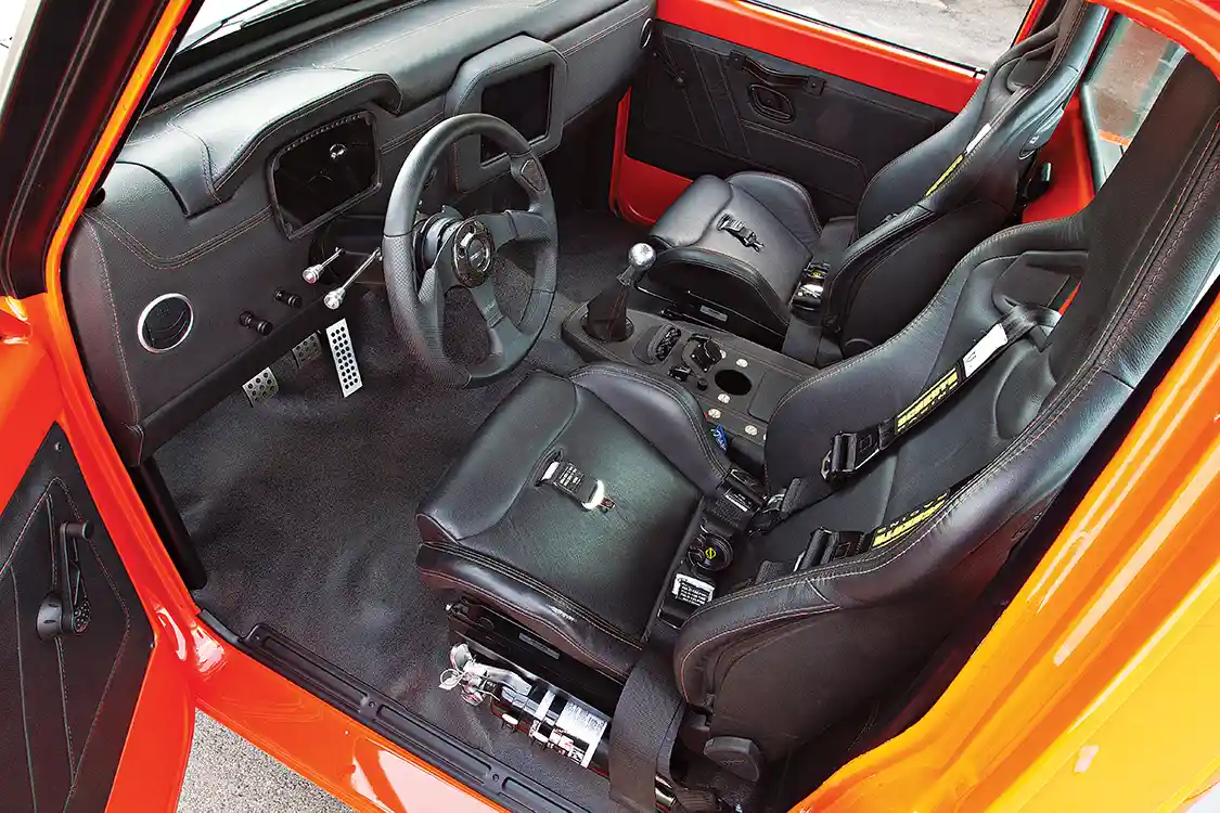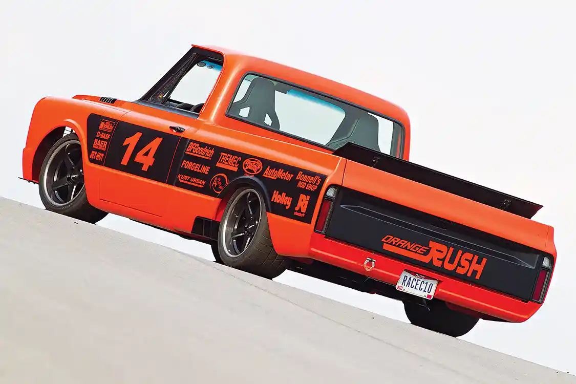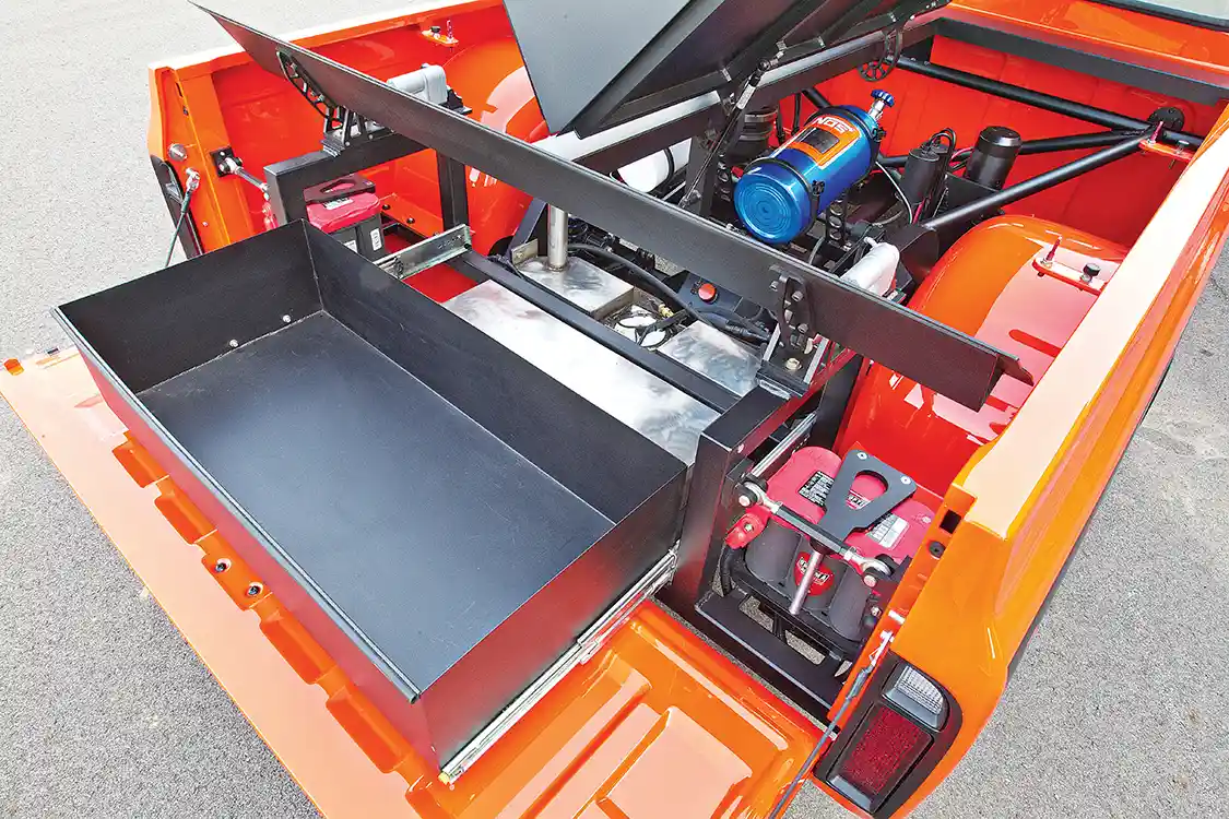 Helping out the interior, RPM Hot Rods upholstered the Recaro seats in black leather with orange stitching, along with the dash, door panels and console. Then the truck was sent to Hutter Performance so that the motor could be tuned to push 529 hp at the rear wheels. Bob and Shayne finished the truck at noon the day they needed to leave for the Goodguys Nashville Nationals. With zero miles on the engine, they loaded it into the trailer and planned to run it in Nashville to break it in before the event. Traffic delayed them, so when they stopped to fuel the rig, Bob pulled Orange Rush out and made a 2-mile test run. The next day they competed in autocross and won. ST