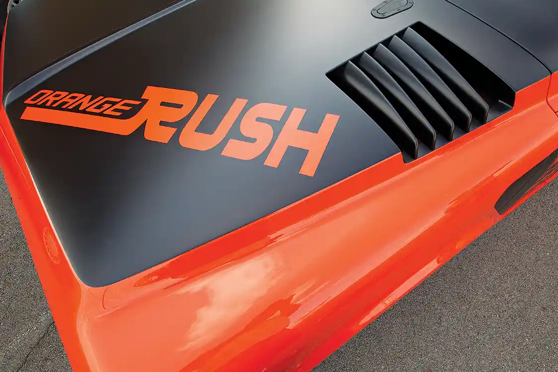 While the truck was being assembled, Bronson from Humtown Products created the door handles and hood louvers using a 3D printer. Once all of the body panels were lined up, Bob took the truck back to Bonnell’s Rod Shop where he laid out tapelines for the black sections of paint. Bob’s daughter Angela designed the “Orange Rush” logo, and they decided at the last minute to add it to the hood and tailgate. Bob and Phil applied the BASF Black base and two coats of satin clear.