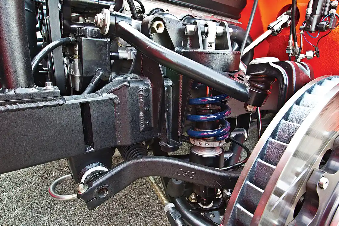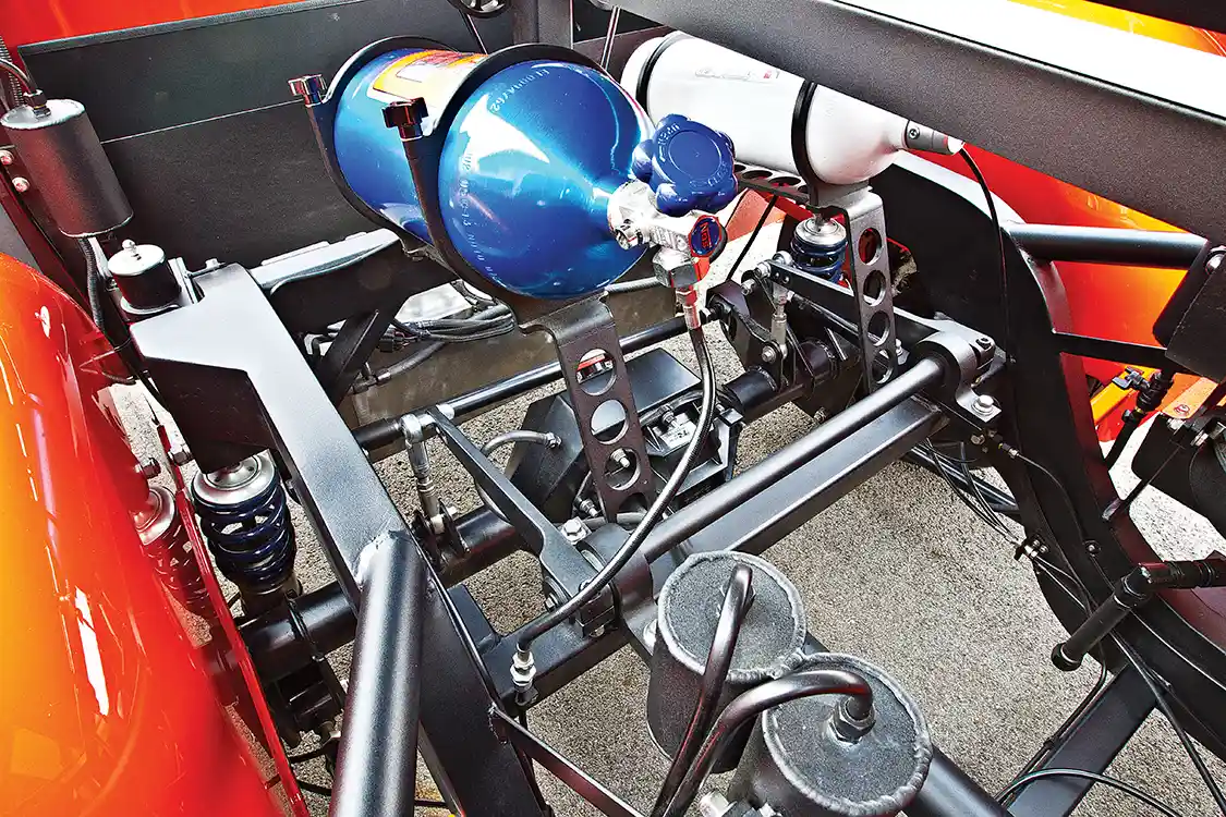 Back at Bob’s home shop, Shayne started the wirin which dyno’d at 648 hp at the flywheel. It was mated to a dual-disc carbon clutch with an LS hydraulic throw-out bearing coupled to a Tremec T-56 Magnum that Mark at Bowler Performance had upgraded. Bob also installed Baer 6R 14-inch brakes and plumbed the lines along with JRI adjustable shocks with hydraulic lift cylinders, which would allow the truck to be raised 2 inches to get into a trailer or to fit a jack underneath without affecting the performance of the coil-over.