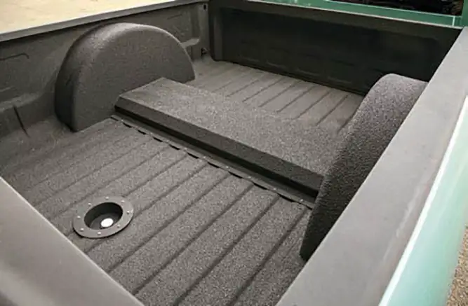 The inside of the bed was changed up a bit to create room for the suspension and large rollers. Part of this includes a notch cover and wheel tubs to hide the cuts. Since the fuel tank was fitted to the rear, a custom filler was cut into the floor of the bed. When the sheet metal work was finished, the bed was coated in spray-on liner at Ekstensive.