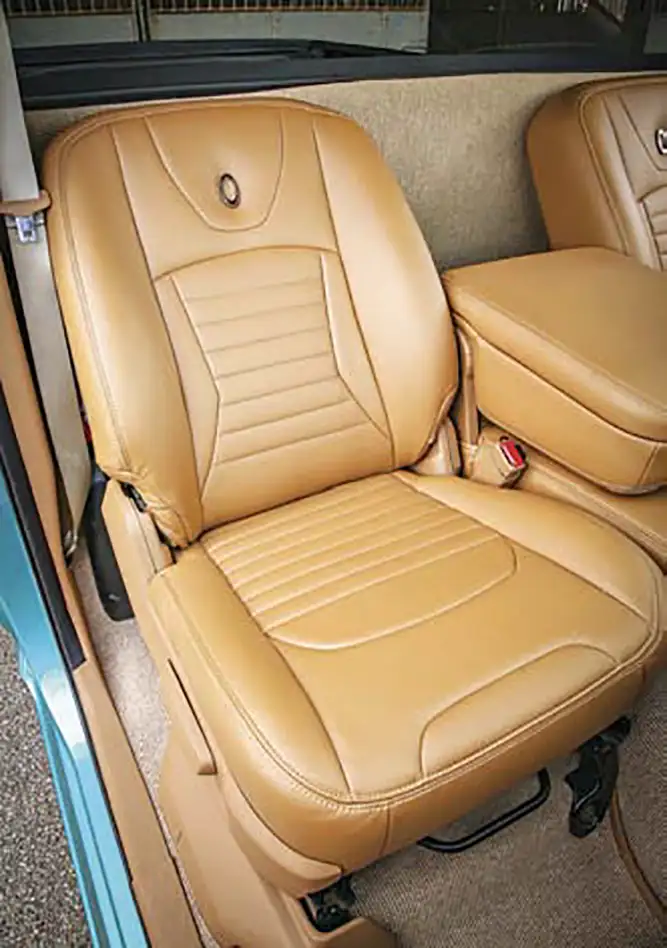 Taking care of the other loose ends up front, the battery, fuse box and computer were relocated, while another set of wheel tubs was added to minimize the amount of dirt that’s flung up into the engine bay. The stock exhaust manifold was modified for ground clearance and a 2 ½-inch exhaust was made featuring a pair of Magnaflow mufflers.