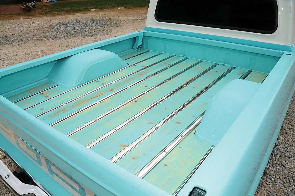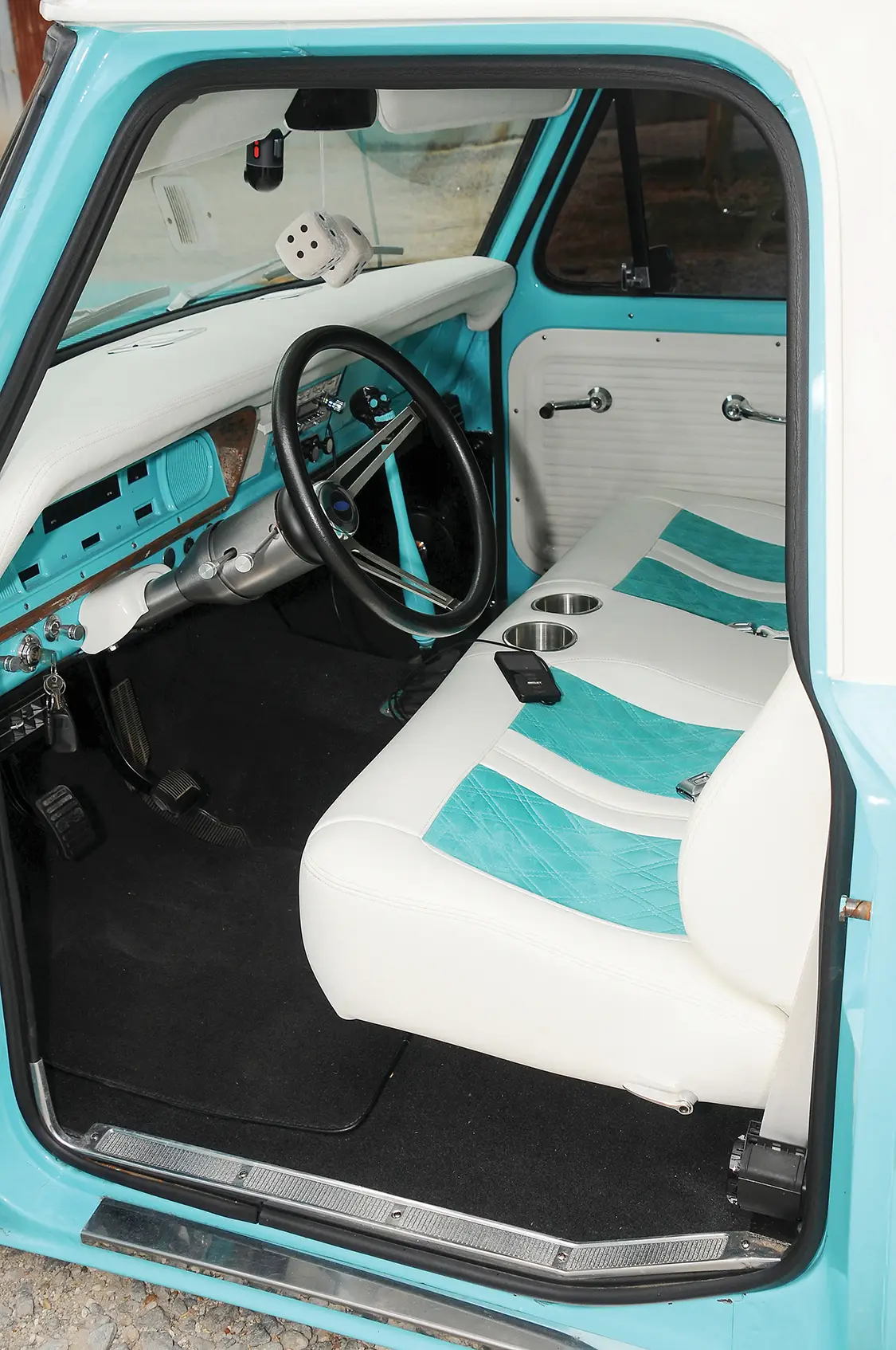 At the Cruisin’ the Coast show, Todd met Stacy Bearden from Superior Bedliner and Window Tint, and the two clicked within minutes. Todd knew instantly that he wanted Stacy to handle the entire build. Within the next two months, Stacy had ripped apart the stock suspension, added a full Accuair air management system, and added a raised bed that hides all the integral parts and can be lifted to access the fuel tank and air-ride parts. The next step was the interior, as the stock ’67 cabin was replaced with brand-new leather and era-corrected to make it more modern. The headliner was then redone with a diamond stitch material, and billet cup holders were mounted in the bench seat for convenience. A CJ Classic Trucks steering wheel was installed to the Ididit steering column with a six-bolt, three-spoke design.