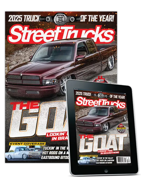 Street Trucks is the ultimate source for the custom truck lifestyle, blending bold style with serious performance. As the leading authority on late-model and classic truck customization, Street Trucks delivers high-impact content for builders, enthusiasts, and fans alike. Inside each issue, you'll find in-depth tech coverage, step-by-step install guides, exclusive shop tours, and full features on some of the most jaw-dropping custom builds from across the country.