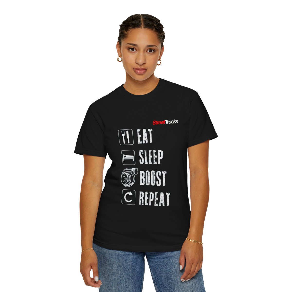 This heavyweight garment-dyed tee speaks to people who live for the sound of a spool spooling and the rush of boost. Soft, lived-in color and a relaxed fit make it feel broken-in from day one. Bold white icons down the front — Eat, Sleep, Boost, Repeat — pair with a subtle red logo at the nape for a low-key, motorsport-ready look. Wear it to wrench in the garage, lean on the pit wall, or meet up with the crew after a long drive. The shirt’s durable construction and pre-shrunk 100% ring-spun cotton mean it stands up to weekly use and frequent washes while keeping its texture and color. Available in a wide range of colors and sizes, this tee blends workshop practicality with street cred for anyone who treats boost as a lifestyle.Product features- 100% ring-spun US cotton — soft, durable, pre-shrunk- Garment-dyed after construction for a vintage, broken-in feel- Heavyweight fabric (6.1 oz/yd²) with relaxed fit for durability and comfort- Double-needle stitching and tubular (no side seams) construction for long-lasting wear- Sizes S–4XL and 58 color options; sewn-in label for authentic lookCare instructions- Machine wash: cold (max 30C or 90F)- Do not bleach- Tumble dry: low heat- Iron, steam or dry: low heat- Do not dryclean
