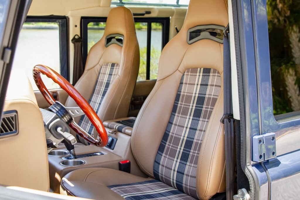 The interior of Project A-Layne is luxuriously designed with inspiration from its European roots. The Corbeau Trailcats and rear bench seats are upholstered in Italian Spinneybeck Espresso leather with a custom blue and beige tartan pattern in the center. The cream headliner and cappuccino-colored wool carpet of this D110 make the interior look bright and rich. Similarly, colored floor mats offer protection for the carpet. The wood-grain accents of Project A-Layne complete the look. Modern technology in this custom D110 includes CarPlay for Apple or Android devices, wireless charging for mobile devices, a premium JL Audio sound system, and USB ports throughout.