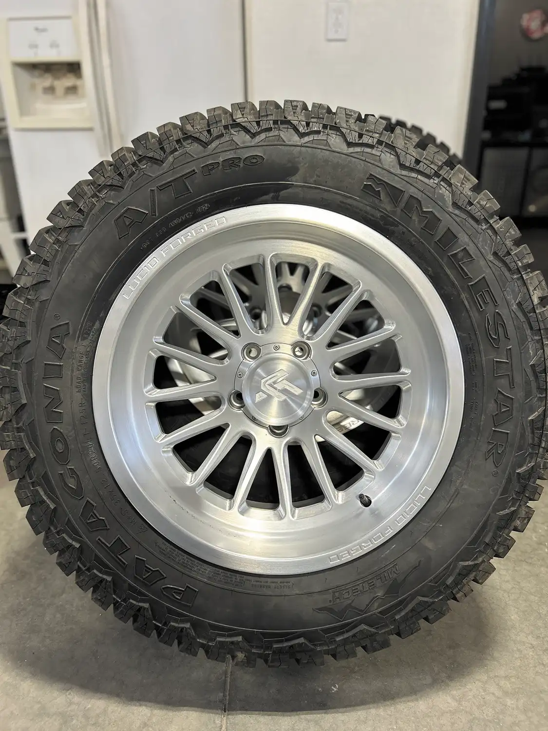 This wheel and tire setup features 20×10 Lucid Forged brushed Outcast wheels and 35/12.5×20 Milestar Patagonia A/T Pro tires.