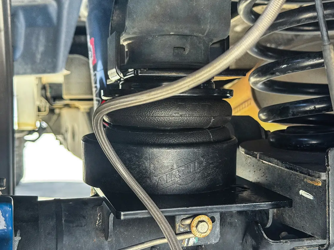Installation is straightforward and requires no welding or frame modification beyond minor trimming in select areas. Using common hand tools, including a ratchet, sockets, a torque wrench, and a die grinder, the kit bolts into place in an afternoon. Key components include reinforced upper and lower brackets, roll plates for load distribution, and stainless steel braided air lines. Brake line relocation brackets are included to maintain proper routing and clearance. Air can be managed via Schrader valves mounted in the rear bumper or wheel well or upgraded with an onboard compressor for on-the-fly adjustments.