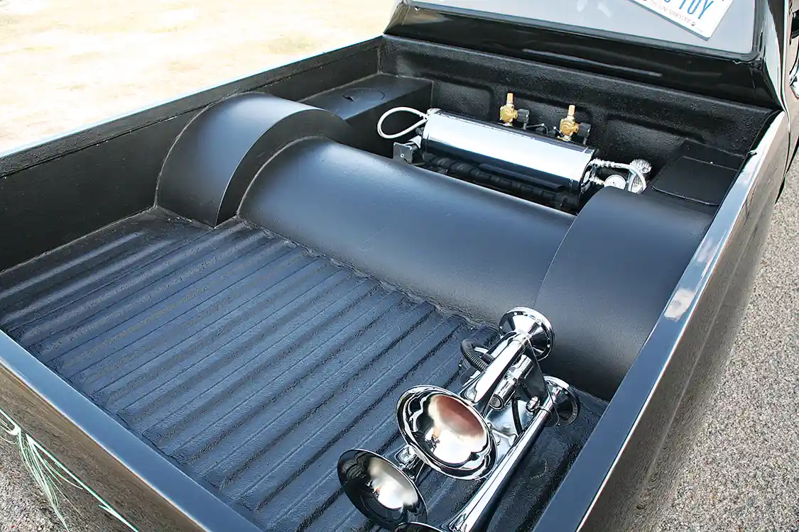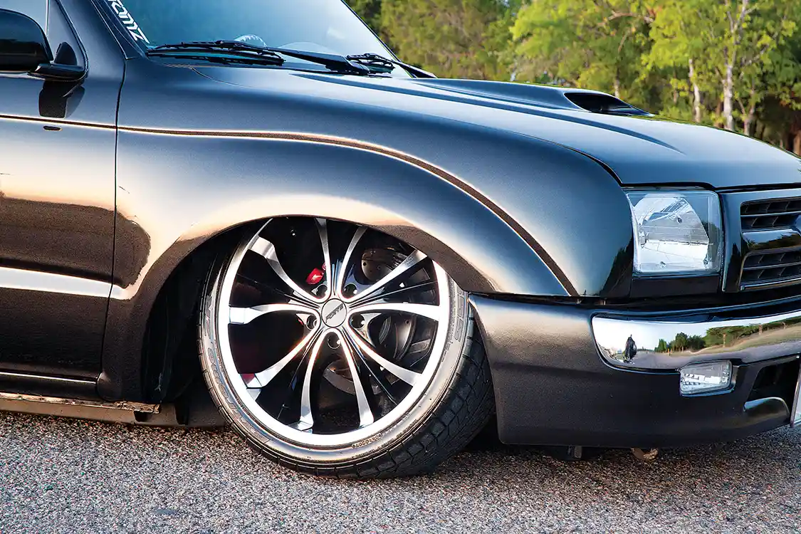 Once he had the truck in his clutches, Matt immediately went to work on it. “My dad and I spent so many hours on our backs in the garage fixing stuff, replacing parts, so of course I learned a lot from those days.” They got the truck up and running respectably again, so it was time to customize. Even though Matt had scored the truck for nothing, money was still an issue, but he made sure progress happened. First, all of the dents and rough spots were straightened out in preparation for the full color change he wanted. Once that was done, the rear was dropped 2 inches to level out the stance, and a set of 20s was brought into the mix. The truck was coming together faster than Matt had ever thought it would, and when he eventually bought a house, he used the first-time buyer rebate for an air ride system.