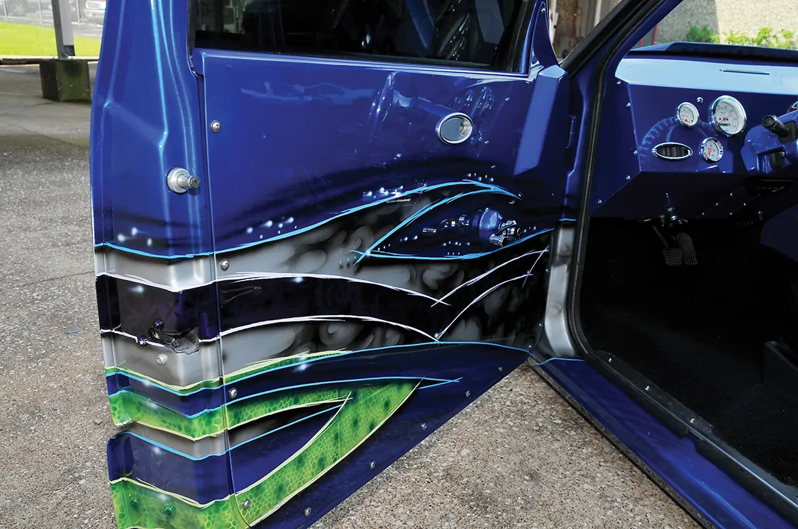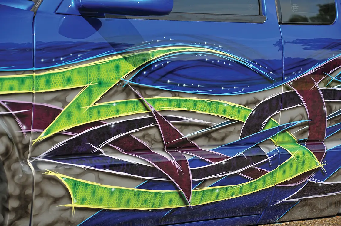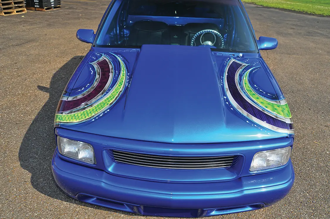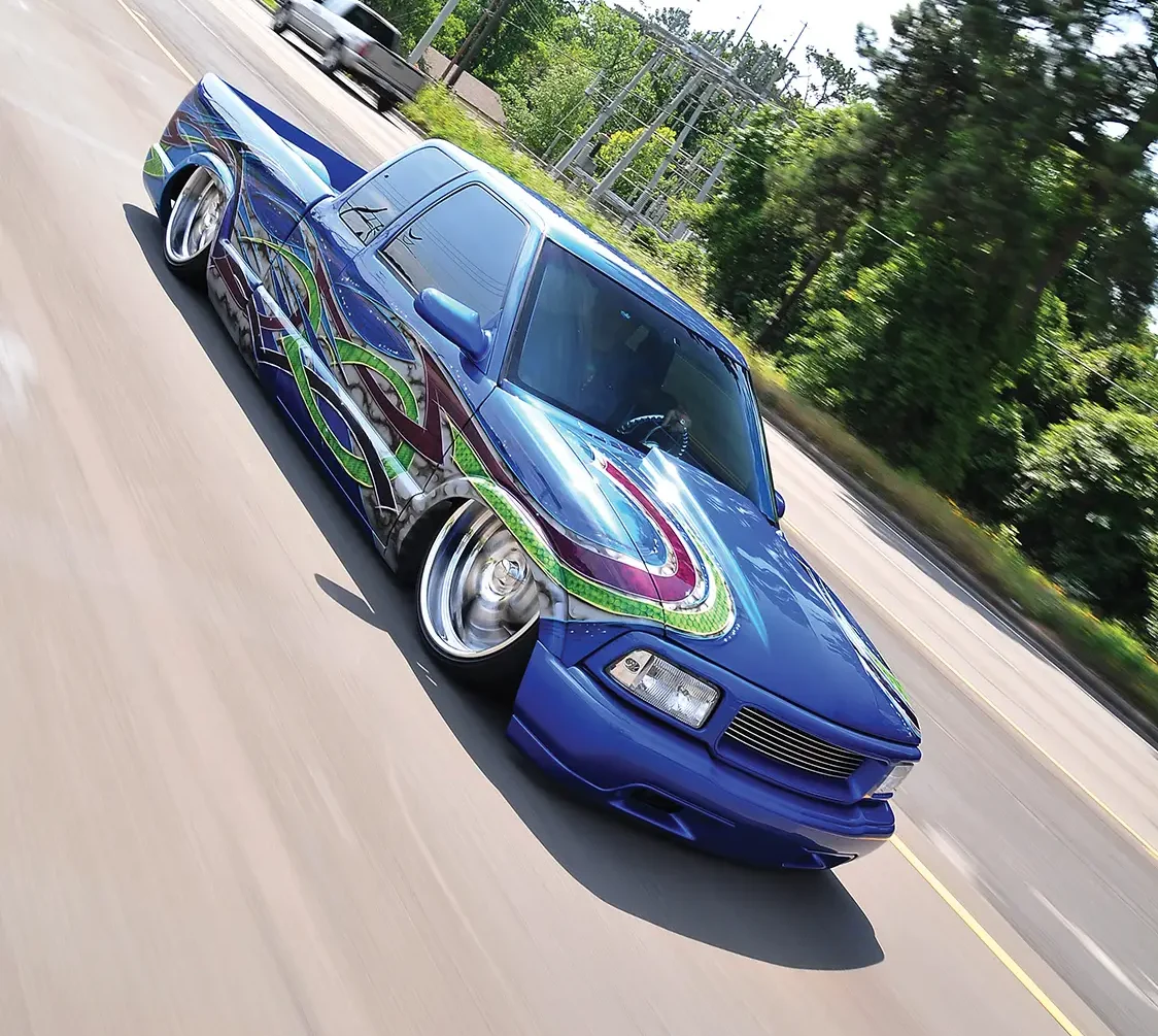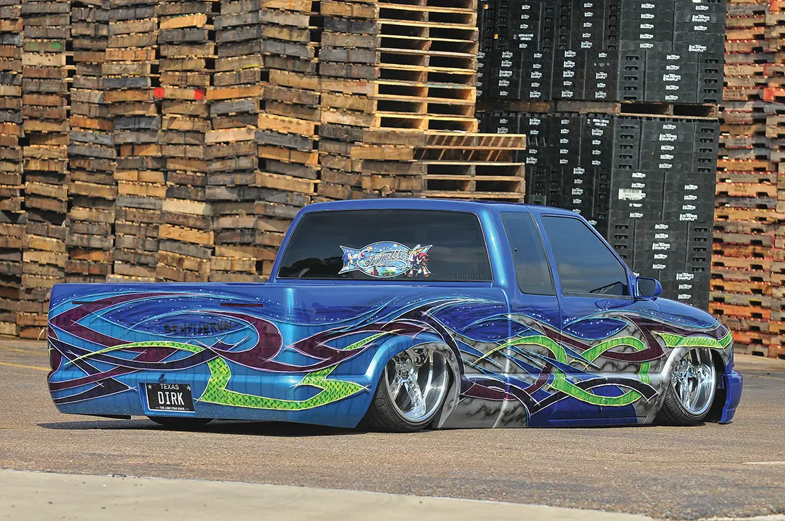 His love for trucks and his appreciation for everyday colors increasingly grew with each day he was recovering at home and going to therapy. As fate would have it, that same mini-truck that Derek had pined over became available from a guy named Rook in Tomball, Texas. After some negotiations, Derek and Rook agreed on a price, and the Sonoma became the first mini-truck Derek had ever purchased. Once he took possession, Derek brought the truck to a show as-is and parked with the Committed Truck Club since he knew them all pretty well. The president and official painter of the club, Patrick Reid, immediately realized ideas for what could be done to update Derek’s Sonoma.