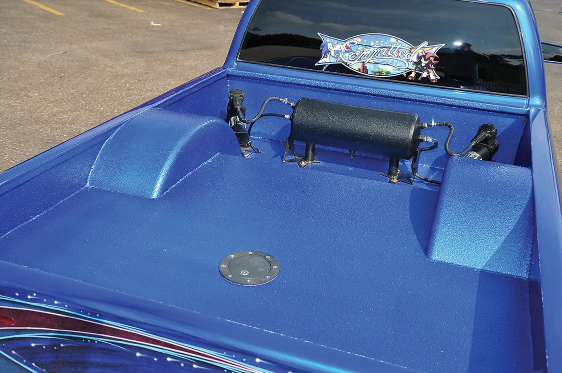 The truck was in pretty decent shape because it hadn’t been driven much in the six years since its cover shoot, and it certainly hadn’t been to many shows. Shortly after the show, Derek brought the truck to Patrick Reid, where he tried to find the original paint codes from back when it was originally built. Unfortunately, those colors had been discontinued, so it was time for a complete overhaul. Once Patrick began stripping the paint off, he saw some poor bodywork and Bondo that had to be redone. Patrick got to work adding a full paint job, but he won’t disclose the exact paint color mixtures he used, so don’t hold your breath. “When I dropped the Sonoma off, all I said was that I didn’t want yellow,” Derek admits. “The rest was up to Patrick to figure out.”