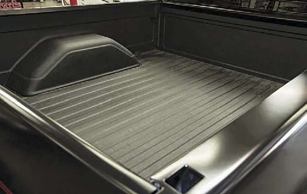 The satin black finish continued onto the rest of the truck, but first a few custom touches were added. After all, it’s a parts runner for an innovative hot rod shop. A Sir Michaels roll pan cleans up the back end, and a custom-made grille insert and blacked out grille provide a menacing look up front. The inside of the bed was hit with a spray-in bed liner to keep engine and body parts from scratching the sheet metal while on parts runs. The hood is the centerpiece, featuring a series of louvers that mimic old salt flat vehicles that needed extra air intake. The motor was kept factory, with a Magnaflow exhaust providing added power and a low rumble. The truck was blocked smooth and painted urethane satin black before Dennis Ricklefs laid down some lines and the American Hot Rods door logo to complete the shop truck look with hot rod flair.