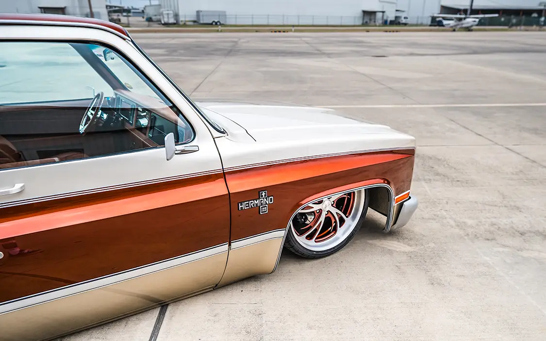 Speaking of builds with meaning, check out Hermano, Earl Brignac’s tribute truck for his late brother. It’s a 1986 Chevy Silverado, riding on an Acme chassis, with a fresh LS under the hood, and a paint combo that pops hard thanks to Alamo Customs. This one’s more than just sheetmetal; it’s family.