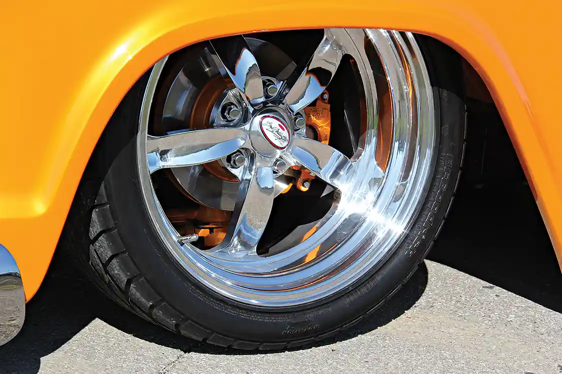 Mike utilized the ’55’s ¾-ton long-bed frame and welded in a Fatman Mustang II front clip with Heidts 2-inch dropped spindles and Scott’s Hotrods upper control arms. To achieve adjustable ride height with layout capabilities, Mike installed a pair of Firestone pneumatic ’bags at all four corners. Front and rear braking were updated with a set of late-model GM disc brakes with 11-inch rotors and dual-piston calipers that were linked with stainless steel brake lines. Steering was improved with a Flaming River power rack with a Flaming River chromed shift/tilt steering column capped with a Billet Specialties Stiletto half-wrapped tan leather billet aluminum steering wheel. The frame’s back half was cut to a short-bed wheelbase. The frame rails were bridge-notched to accommodate the airbagged rear suspension, allowing it to lay out. A 1969 Camaro 10-bolt rearend housing was fitted with 3.73 gears and a posi-unit. Mike designed and fabricated his own triangulated- wishbone four-bar rear suspension to anchor the rearend. Spinning style and grip was accomplished by bolting on a set of Boyd Coddington New Wave 18×8 front and 20×10 rear polished aluminum wheels wrapped with BF Goodrich 245/45- 18 front and 275/40-20 rear rubber.