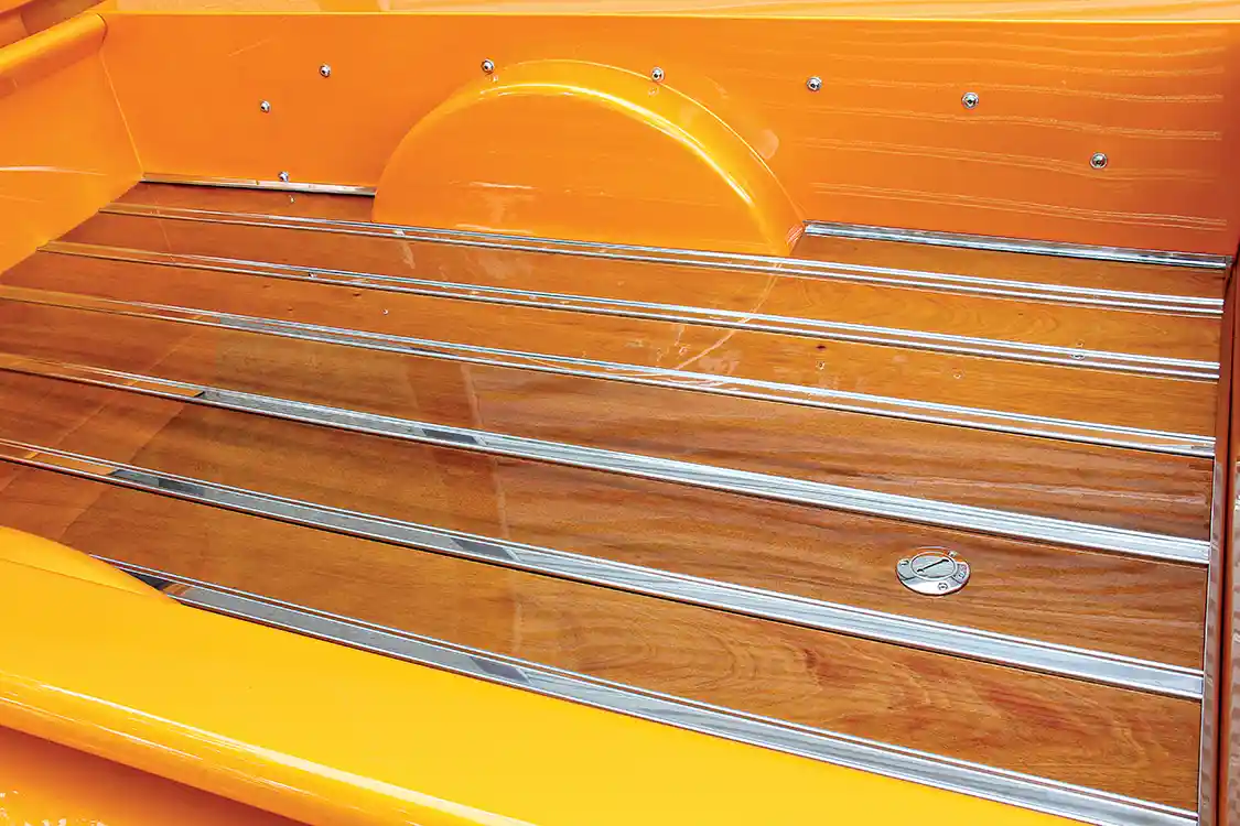 THE MAHOGANY PLANKS WERE SPRAYED WITH HOUSE OF KOLORS SUNRISE AND SUNSET ORANGE PAINT THEN WIPED OFF, LEAVING THE REMAINS IN THE WOOD GRAIN. THE PLANKS WERE BURIED IN 12 COATS OF CLEAR AND SEPARATED BY A SET OF BOLTLESS POLISHED STAINLESS STEEL STRINGERS. AN EASY ACCESS GAS FILLER WAS INSTALLED INTO ONE OF THE PLANKS.
