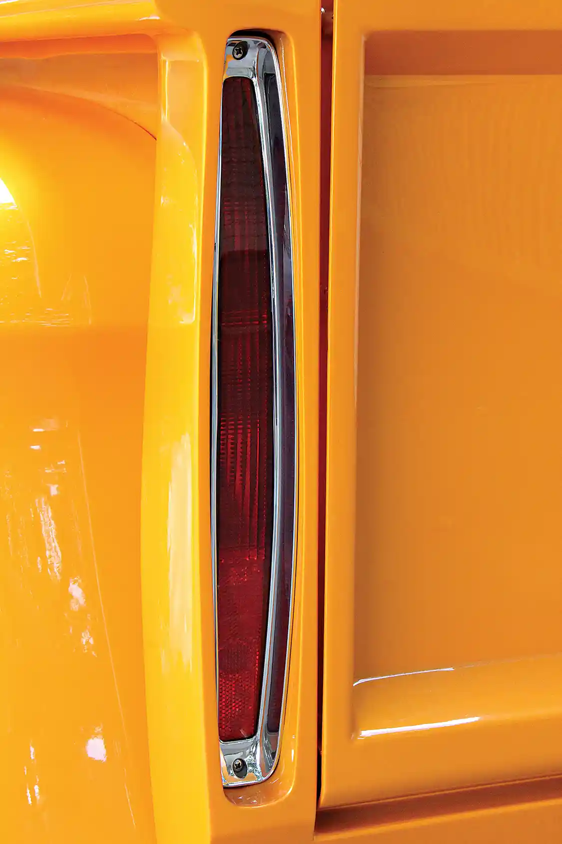 MIKE SHAVED THE TAILGATE AND PAINTED IT. HE GHOSTED IN THE NUMBER “55” BEHIND THE STYLISH CUSTOM-CHROMED V AND AIRBRUSHED A RIPPED AND WAVING CHECKERED BOW TIE LS1 AND FLEUR-DE-LIS EMBLEM. A PAIR OF ’80S CADILLAC REAR VERTICAL TAILLIGHTS FLANK THE TAILGATE ABOVE THE CUSTOM, SMOOTHED REAR ROLL PAN.