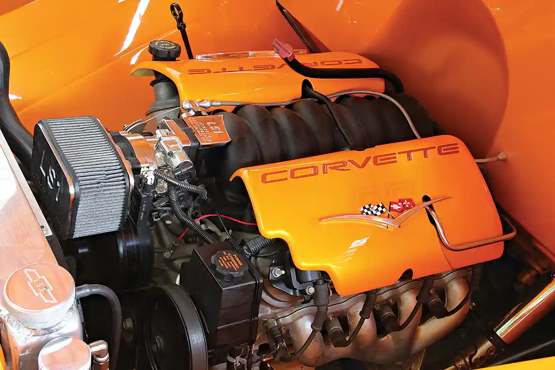RAISING THE HOOD, WE DISCOVERED A 2002 LS1 ENGINE EXTRACTED FROM A TOTALED TRANS-AM WITH ONLY 700 ORIGINAL MILES ON THE ODOMETER. A PAIR OF CORVETTE VALVE COVERS WERE PAINTED AND FIT WITH THE STYLISH CHROMED V AND FLAGS TO MAINTAIN THE CORVETTE LOOK.
