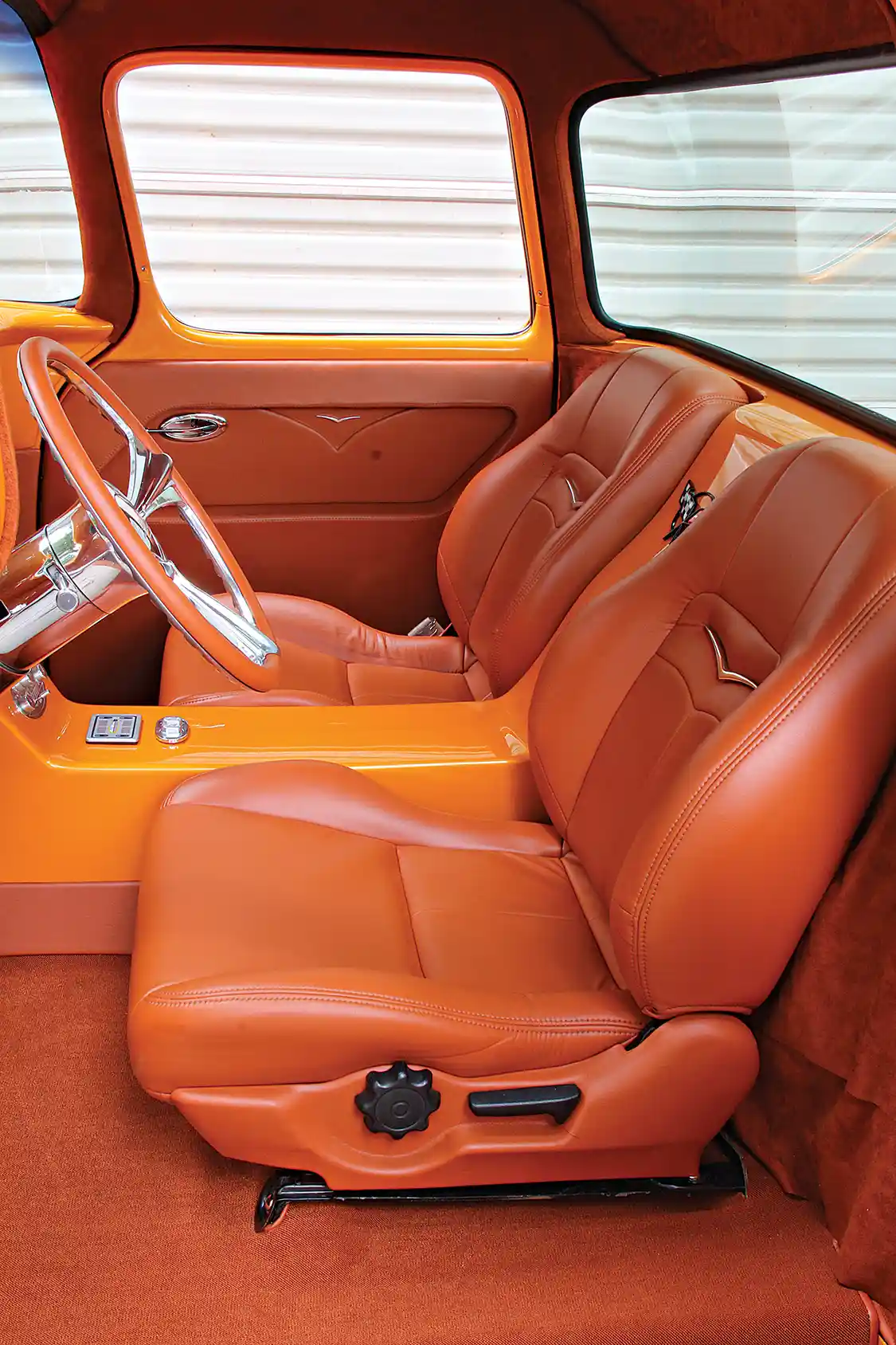 With the metalwork complete, he applied multiple coats of PPG High Build K-38 primer surfacer. Many hours were spent block sanding to get the ’55’s surface straight and smooth. Before applying the color basecoat, Mike applied a couple of coats of white sealer. After mixing a custom basecoat blend, using House of Kolors Sunrise and Sunset pearls, he filled the spray gun pot and started laying down eight coats of Tequila Sunrise. After the color basecoat had time to dry, four coats of Sikkens Autoclear III were applied. Given time to cure, the clear was cut, buffed and polished to a deep, glistening shine. The mahogany wood bed floor was cut and sanded by Mike’s brother Steve. Mike stained the mahogany planks using the same House of Kolors Sunrise and Sunset pearls. The planks were wiped down, leaving the Sunrise and Sunset pearls in the wood grain. To achieve a dramatic appearance, Mike buried the wood with 12 coats of clear. Once the exterior was complete, Mike moved to the inside of the truck.