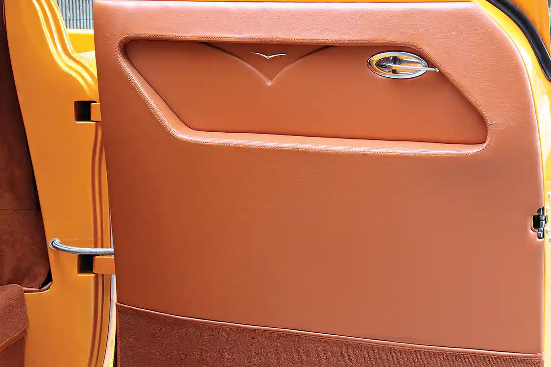 With the help of two friends, Jeff Redding and Eric Wunder, they tackled the audio system, installing a Pioneer CD/DVD head unit powered by two Kicker amps. The cruisin’ tunes are exhausted by a pair of Fosgate 6.5-inch speakers with tweeters mounted in the kick panels. The thunderous bass pounds out of a pair of Fosgate 10-inch subwoofers. A Dakota Digital gauge cluster and gauges were installed into the impressive custom-smoothed steel dash. A custom waterfall center console houses the Pioneer head unit, Vintage Air control panel, Air Ride Technologies control panel and electric window switches. The console separates a pair of Honda Prelude bucket seats with headrests removed. The bucket seats were reshaped with new foam and covered in Mandarin Ultra Tan leather. The custom door panels and headliner were also covered with Mandarin Ultra Tan leather. A layer of Dynamat sound deadening/heat shielding material was laid down before Mandarin nylon pile carpet was laid out.