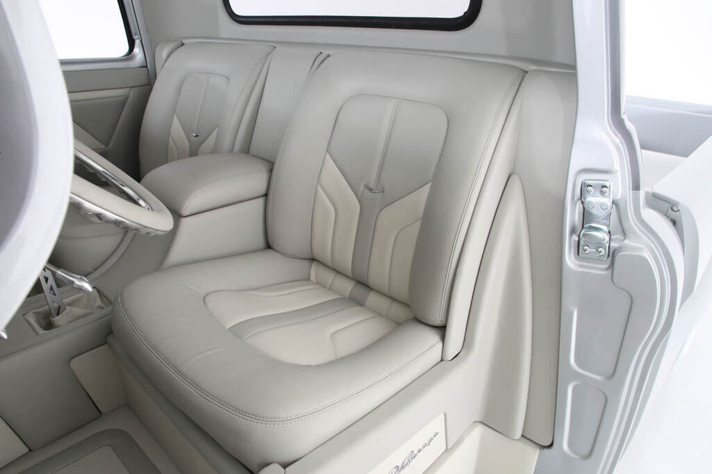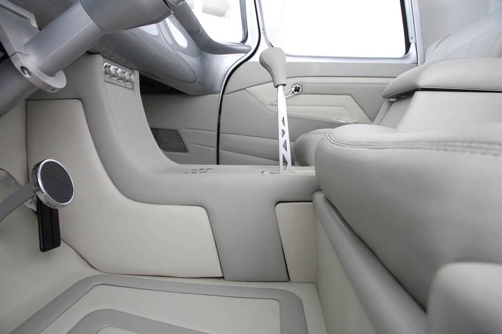 The inside of the cab was completely redesigned to match the classy look of the rest of the truck. The dash was shaved clean and a multitude of accessories were installed. The top was modified to fit a custom seamless headliner, and a center console was handcrafted from scratch. Bucket seats from a Lexus SC300 were modified to fit the luxurious interior. Custom door panels and tons of high-grade leather round out the interior.