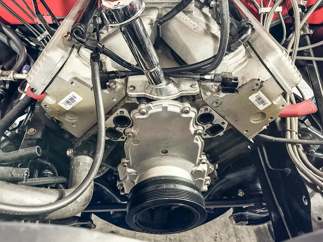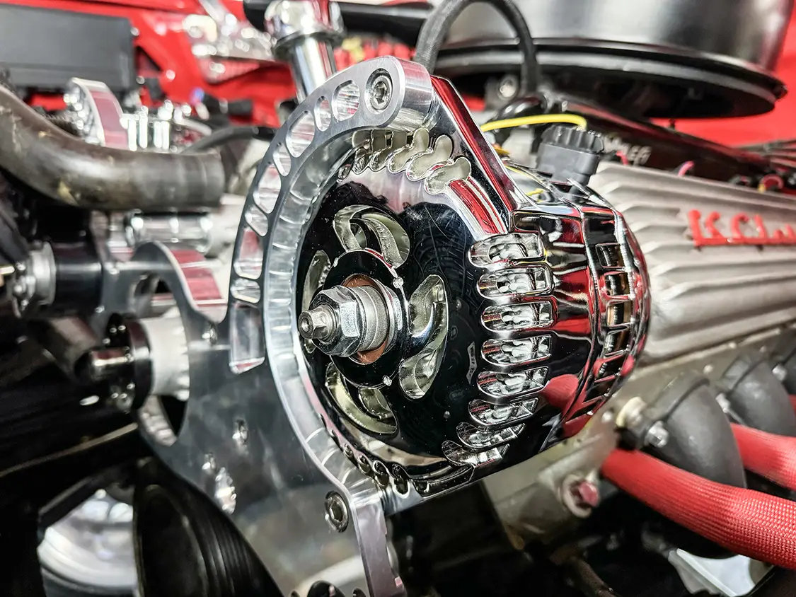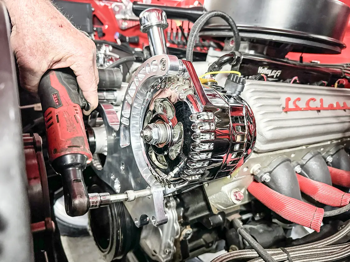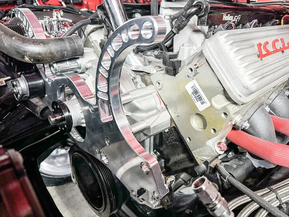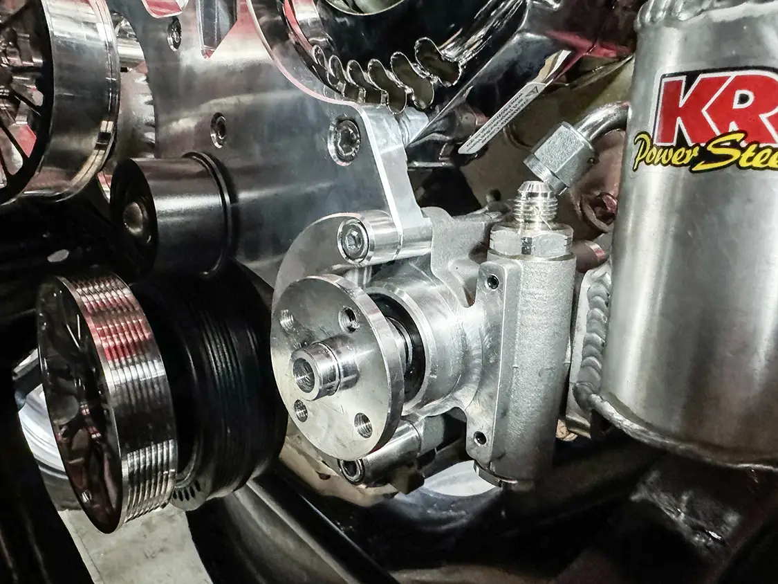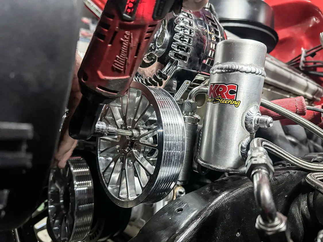 Aside from the polished finish, CVF designed this kit for performance. This setup comes with a high-flow LS1 water pump, a GM Type II power steering pump, and a beefy Sanden-style A/C compressor, all wrapped up with an 8-rib belt system. We even sprung for the upgraded 300-amp alternator, because, let’s face it, we’ve got big power needs, and the stock setup just wouldn’t cut it.
