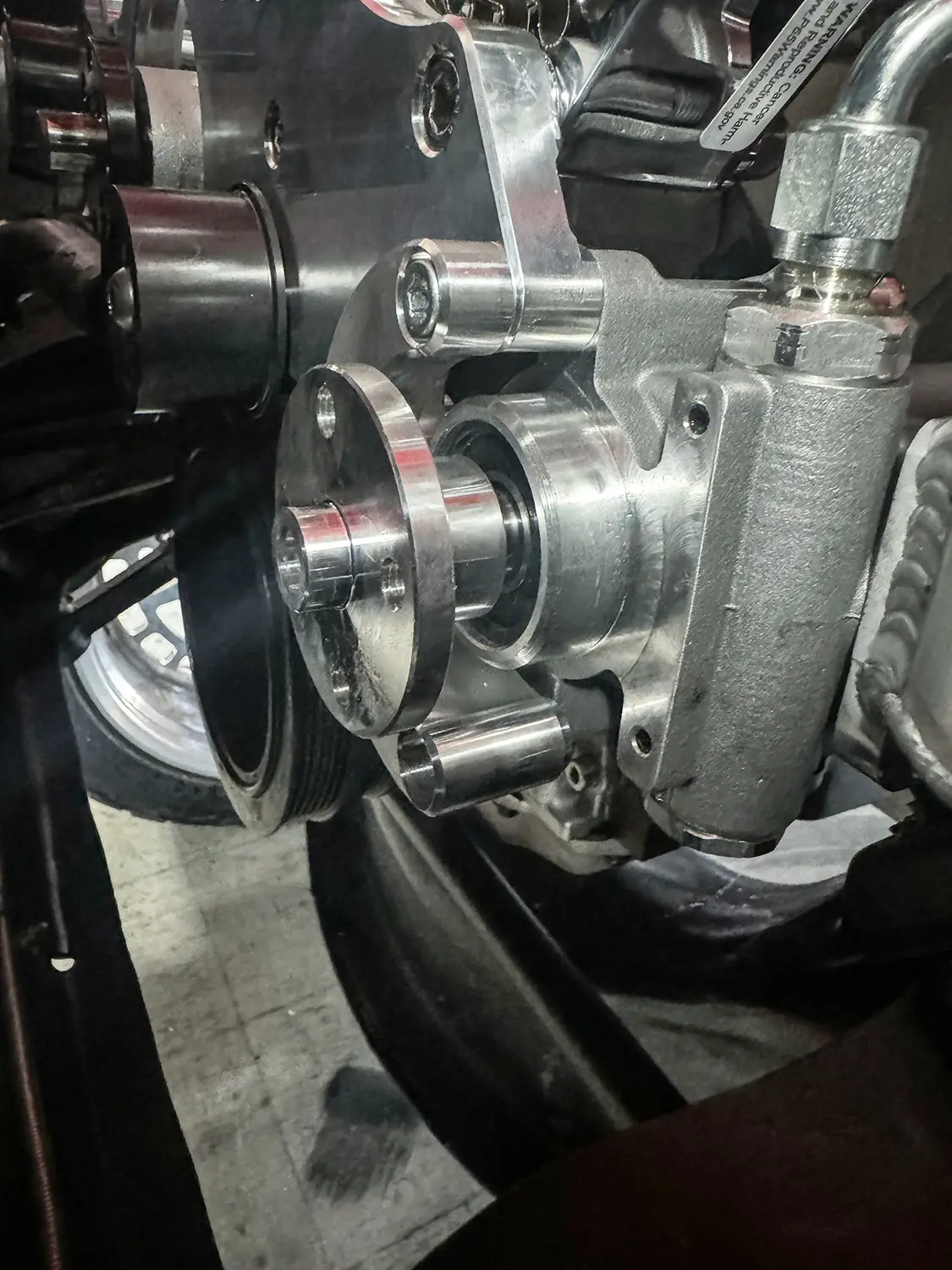 Before we could put the power steering pump on, we had to add this adapter bracket since we chose the upgraded steel reservoir.
