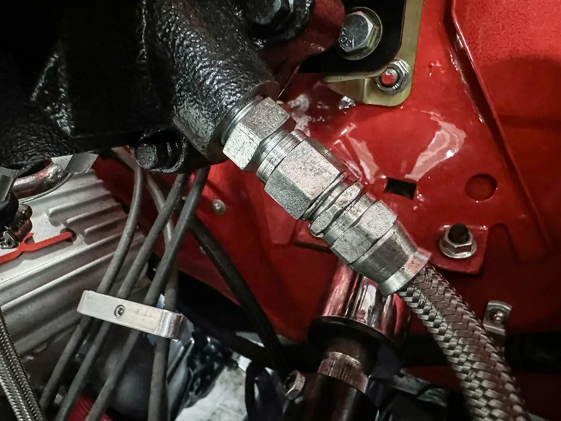 The hydroboost hoses were hooked up next. These are high pressure, so we were sure to use the proper PTFE hoses.