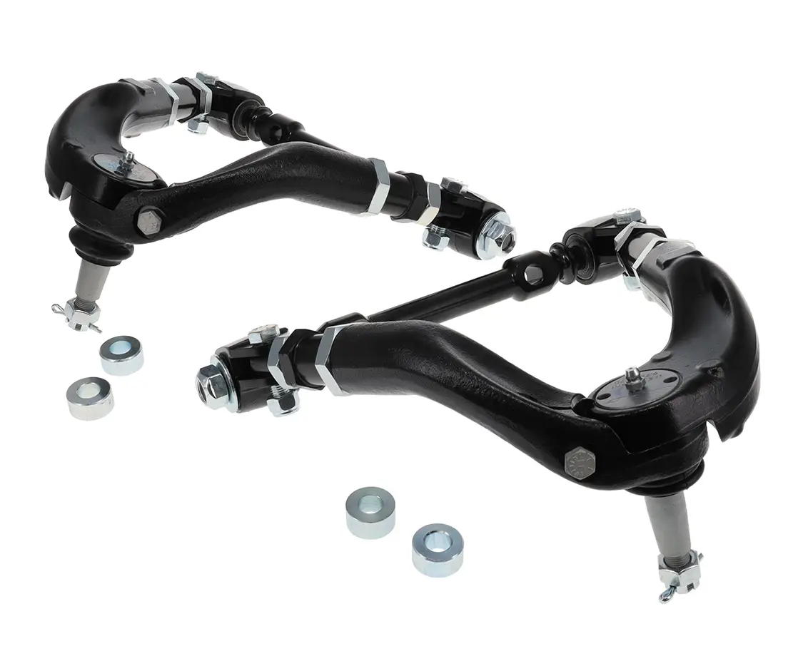 Available for both 1963-1970 GM C10 applications and 1971-1991 GM pickup and SUV models, these unique, patented adjustable upper control arms provide the most adjustability and best clearance of any arms available. Sold as pairs, these forged steel adjustable arms come with ball studs that are ½-inch taller than stock to improve camber curve. Dial in some caster, combined with the ability to adjust camber to yield a truly ‘modern’ feeling suspension.