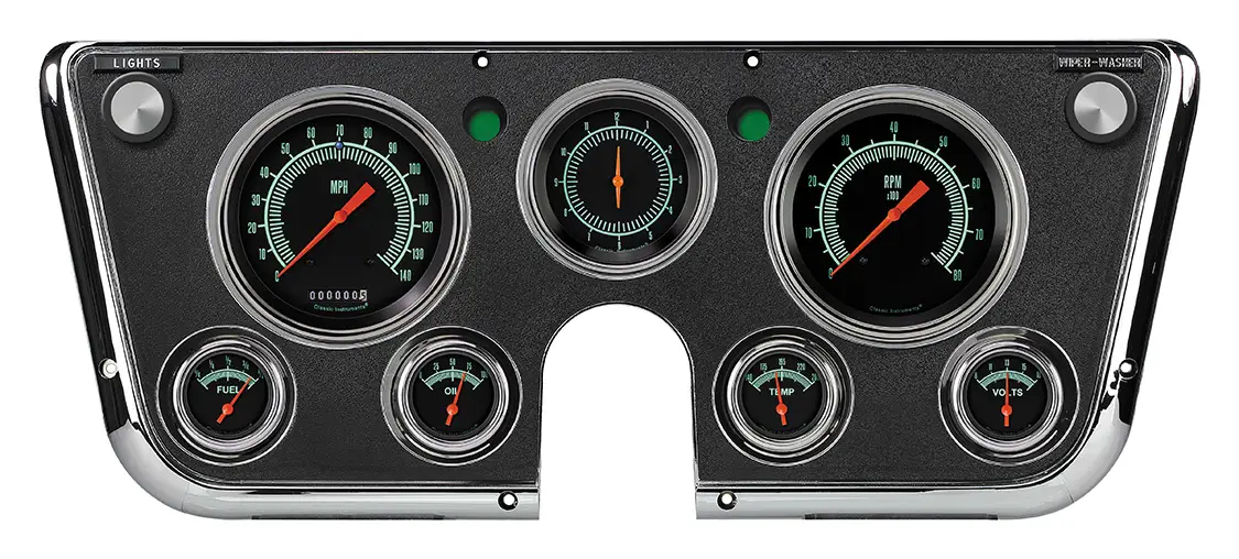 This kit features a 4 5/8-inch speedometer and tachometer, a 3 3/8-inch clock, and 2 1/8-inch fuel, oil, temp, and volt gauges. The set includes pre-wired electrical connections, mounting hardware, all necessary sending units (except the fuel sending unit), and a wiring harness constructed of automotive-grade TXL wire, machine-crimped terminals, and more!
